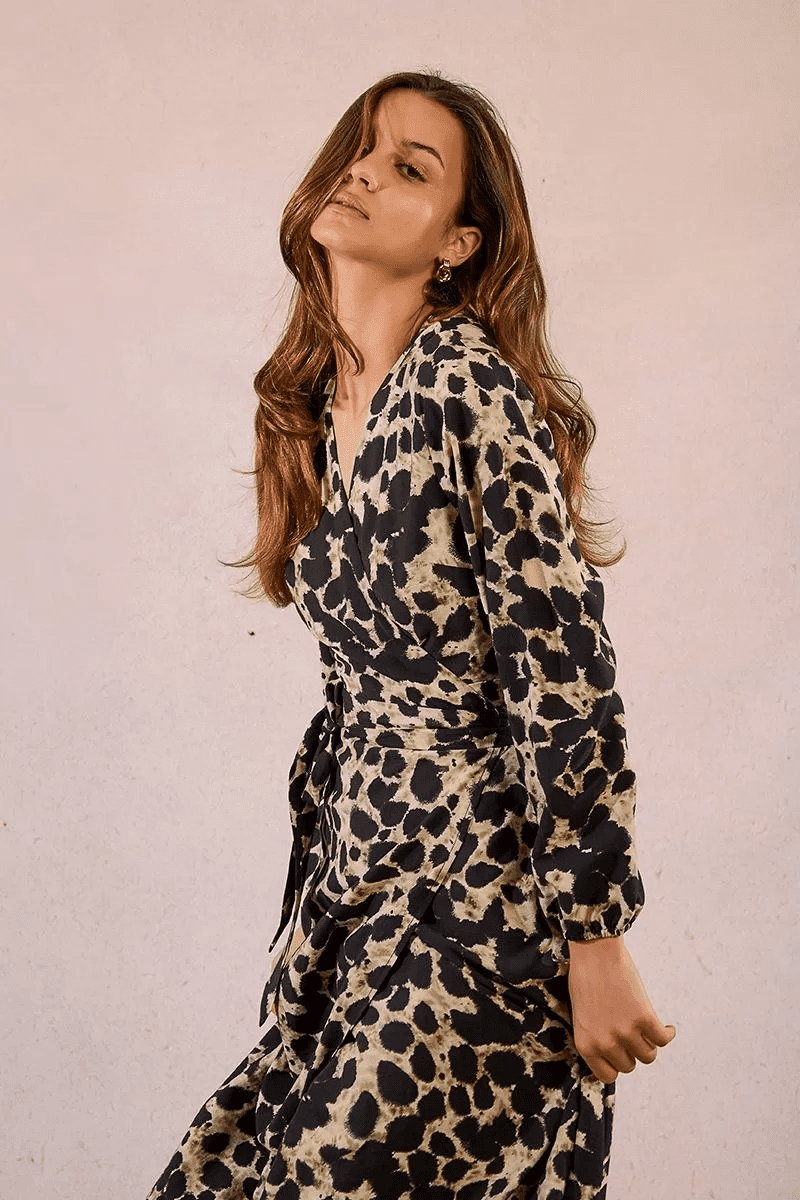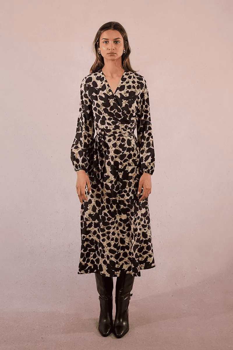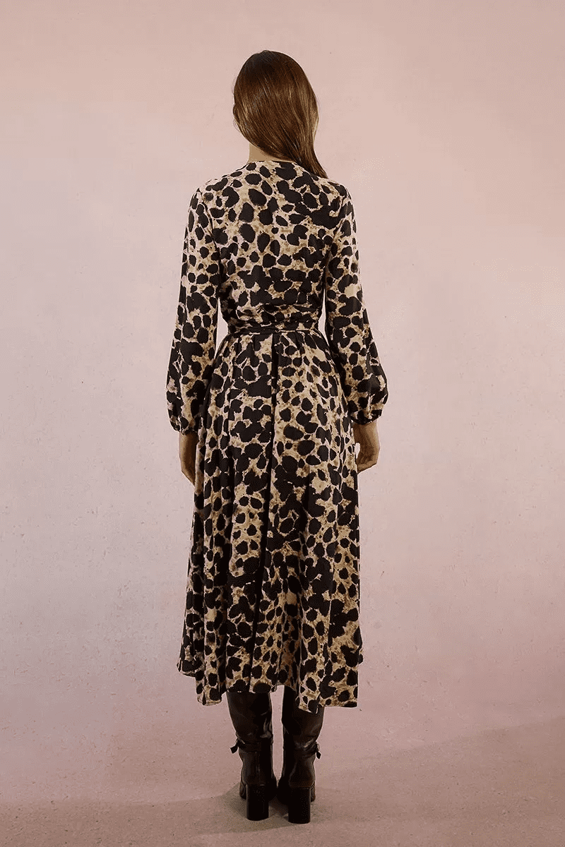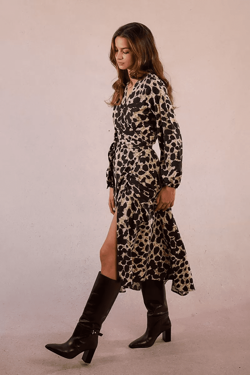 Long animal print wrap dress, with long sleeves which are slightly ballooned, with elasticated cuffs. Crossed V-neckline, belt to tie at the waist, slit skirt bottoms.