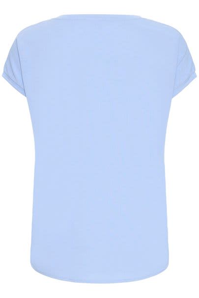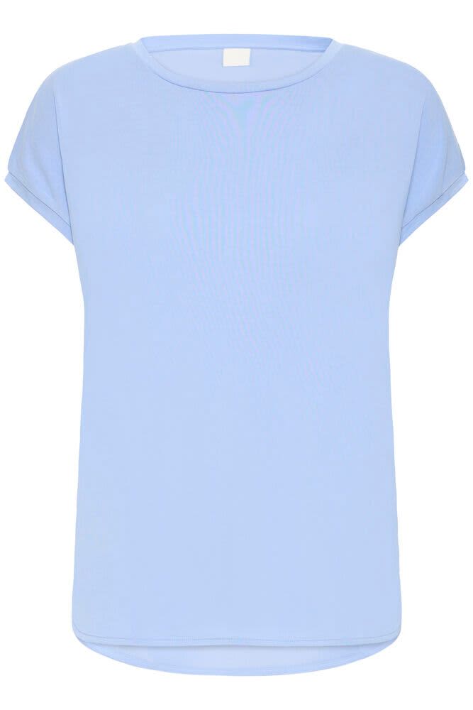 Slinky relaxed fit t-shirt with a clean, minimalist design featuring a straight silhouette, capped sleeves, and a smooth finish. Round neckline and subtle high-low hem add understated edge. Baby blue tone.
