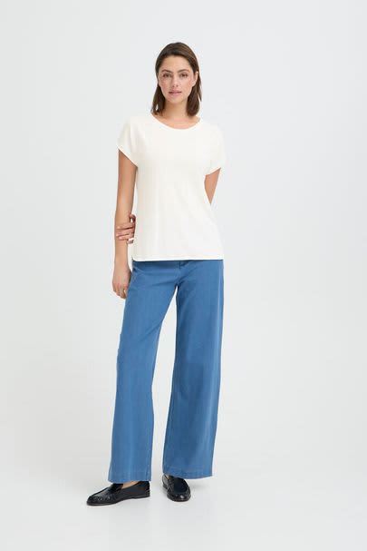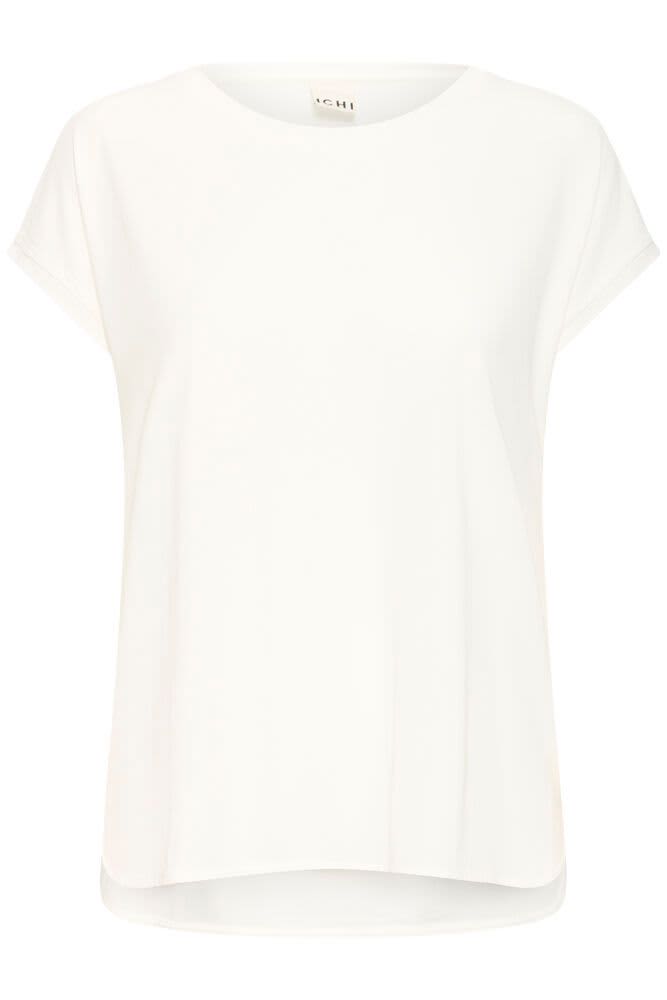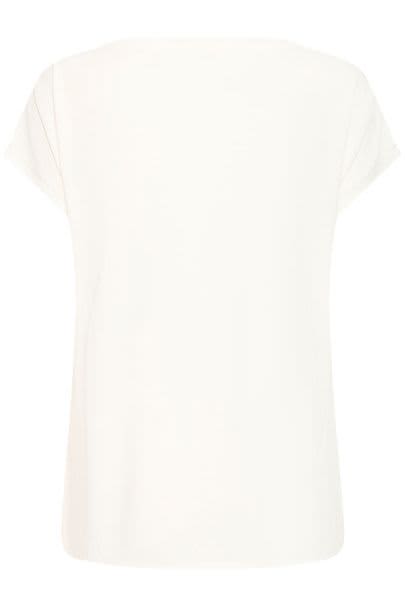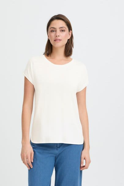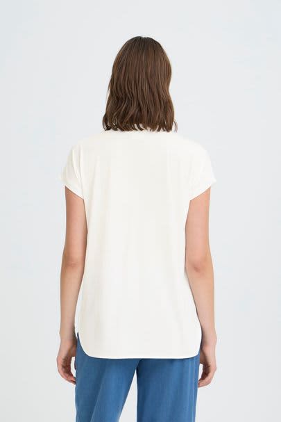Slinky relaxed fit t-shirt with a clean, minimalist design featuring a straight silhouette, capped sleeves, and a smooth finish. Round neckline and subtle high-low hem add understated edge. Ivory tone.