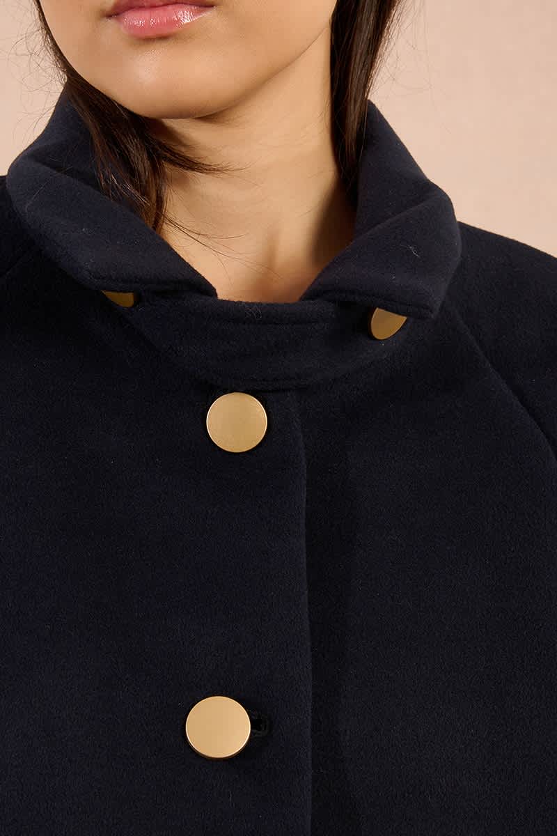 Dark navy wool mix coat with large feature brushed gold buttons and side pockets.