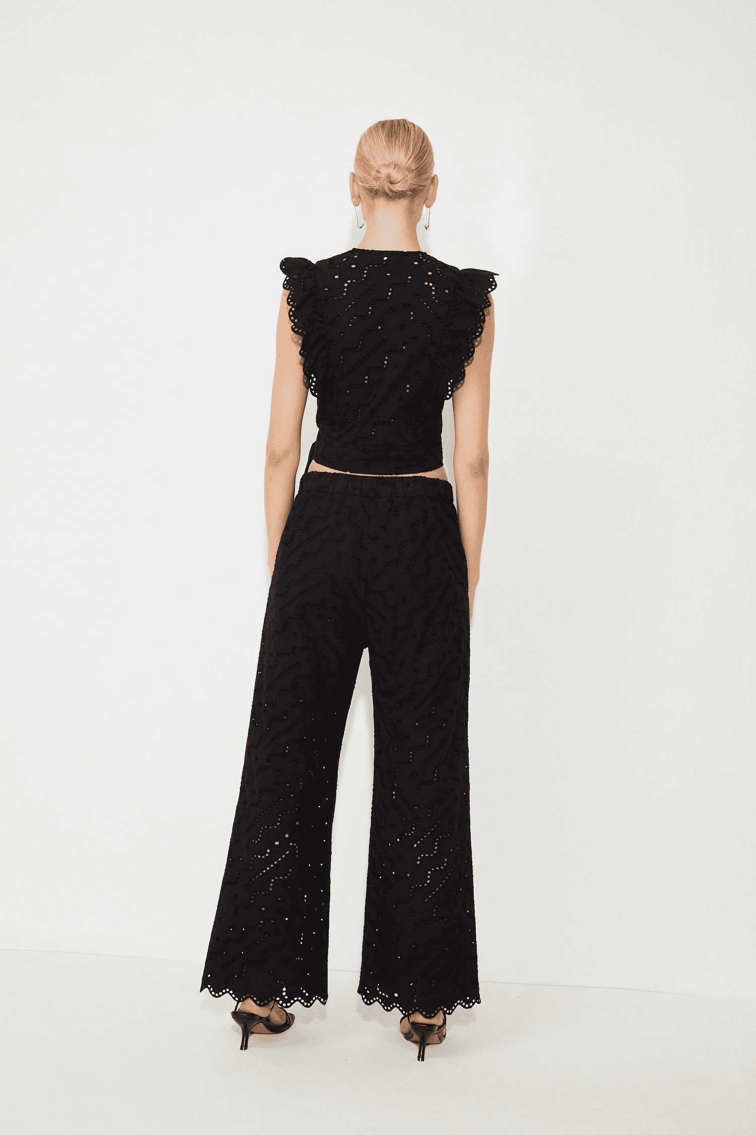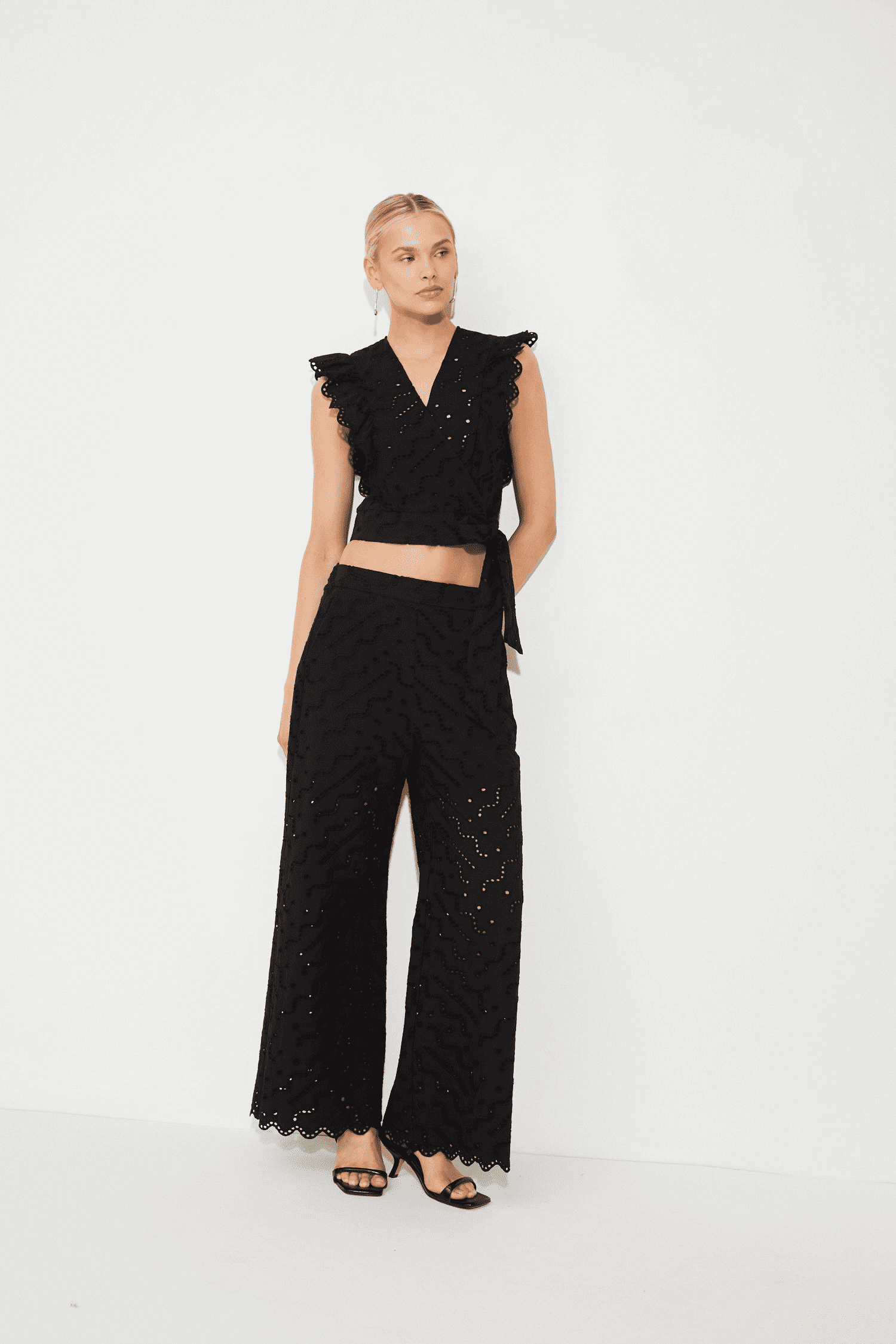 Broderie Anglaise cropped, wrap blouse, with frill shoulder detail and tie at the side.