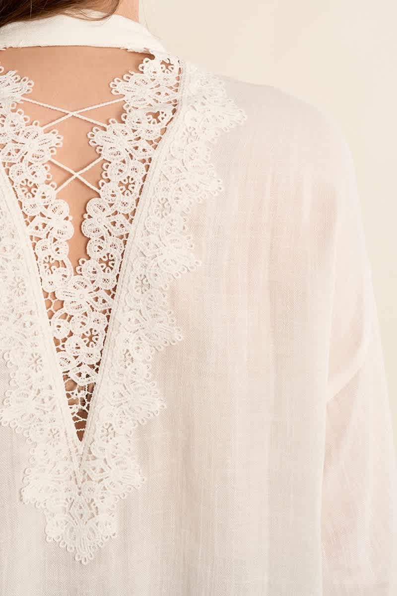 This lace back shirt features a mandarin collar and buttoned cuffs. The lace detail at the back is in a beautiful open V shape making this shirt a very elegant piece to have in your Summer wardrobe. It has buttoned cuffs and a patch pocket on the heart side of the chest. Wear with a wide leg jean and sandals for a cool relaxed yet stylish look.