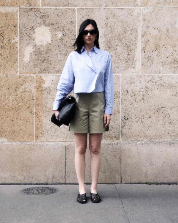 These high waisted taupe shorts feature two pockets to the front and two imitation pockets with flaps on the back which make them more flattering to wear. We love the slit detail on the sides that have a panel to create a lovely cut on the legs. There is also a pleat detail down the front either side of the hidden zip. There are also belt loops to give you the option of wearing a belt. The logo is stitched subtly on the bottom of the left leg. There is also a slight stretch to the fabric making these shorts very comfortable to wear.