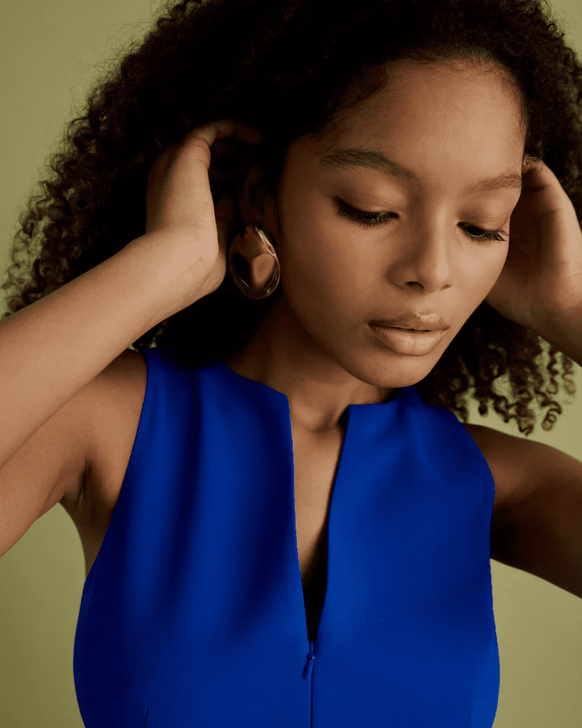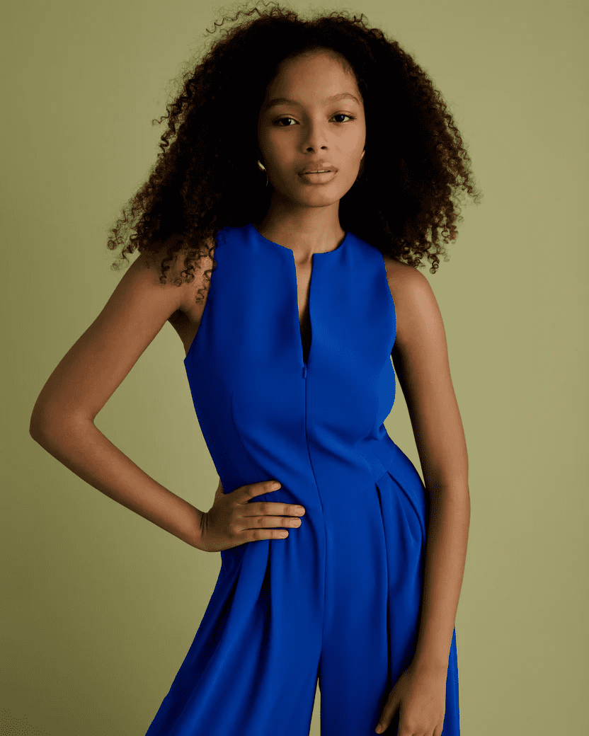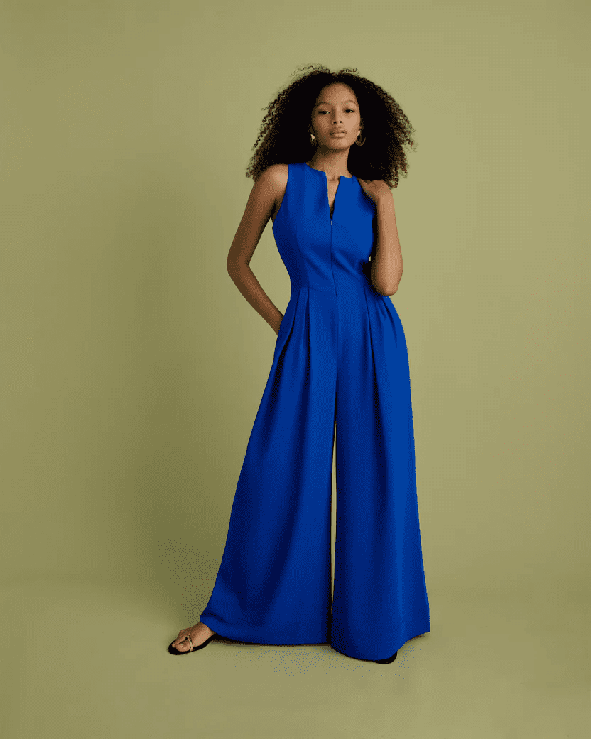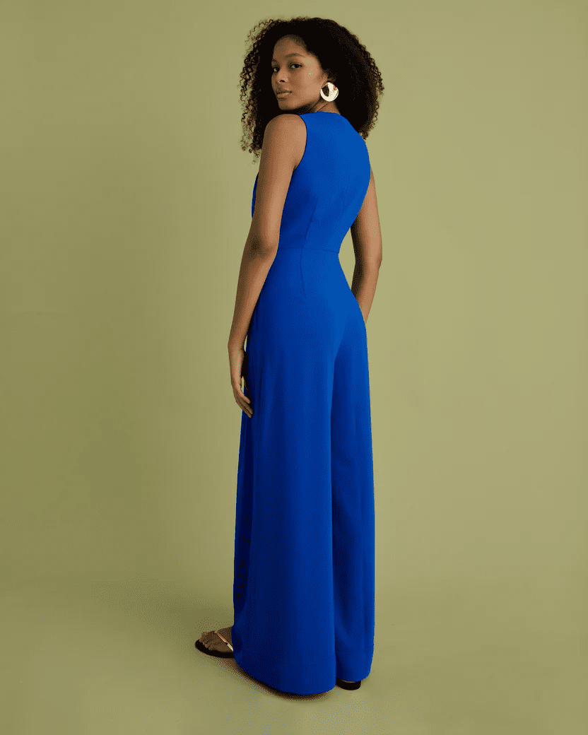 This sleeveless, electric cobalt blue, wide leg jumpsuit features a bodice with a concealed zip front. It is the ultimate piece for a modern tailored look packed with personality. And the best bit is that it even has pockets.