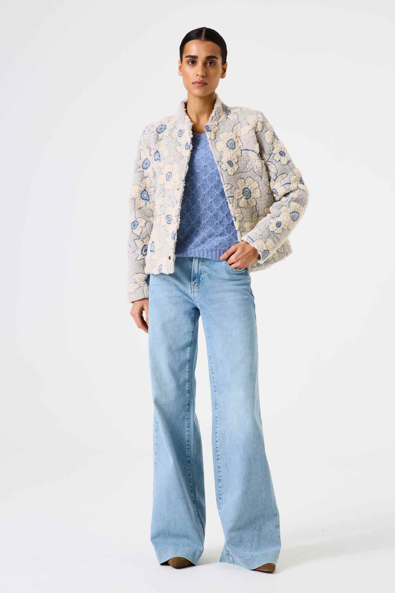 This gorgeous, cosy bomber jacket is in a beautiful winter cream and powder blue. With a floral design and teddy fabric this bomber has a popper close and front pockets.