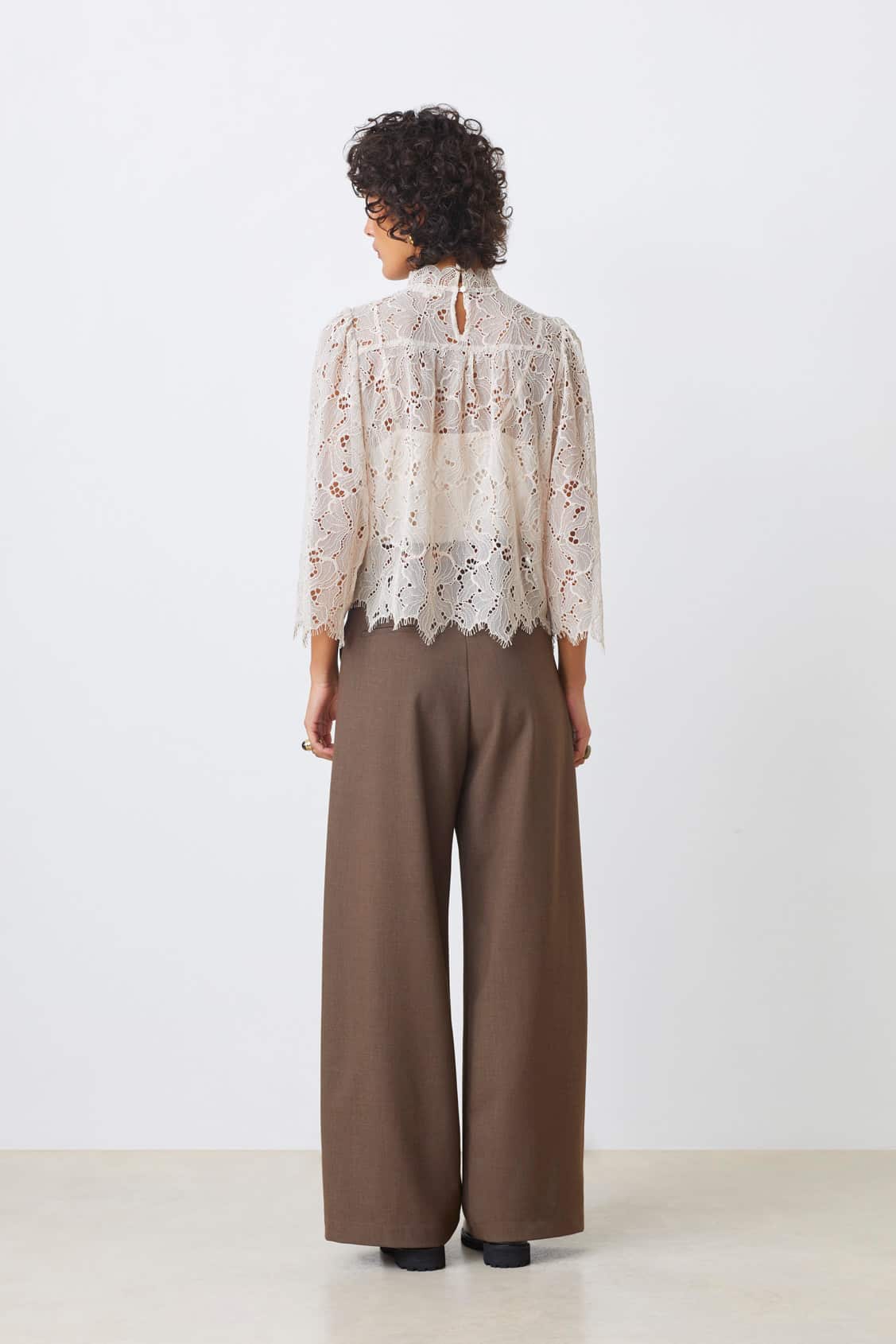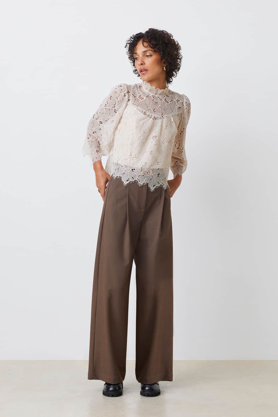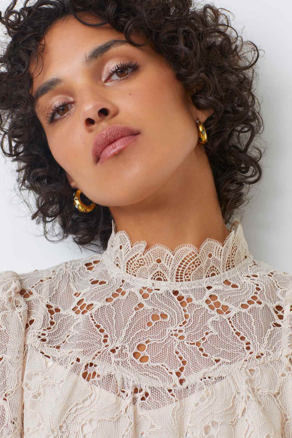 Cream embroidered lace top with high frill neckline, button close neck and wide sleeves. The top comes with a cream cami for underneath. Wear with matching Faye Lace Skirt Latte.