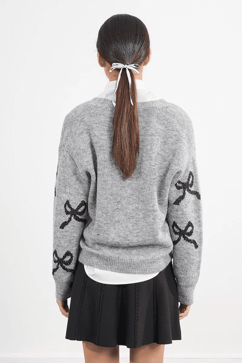 Grey knit button up cardi with subtle black shimmer bow detail.