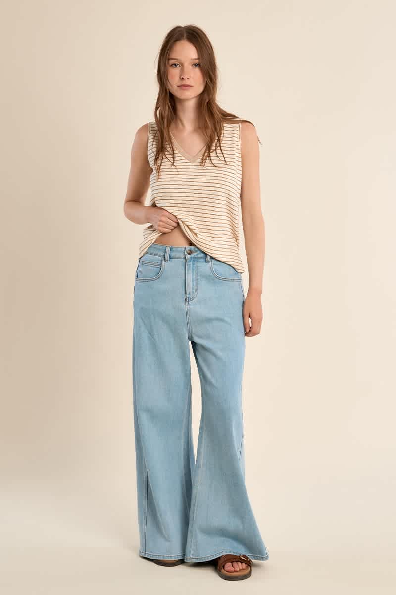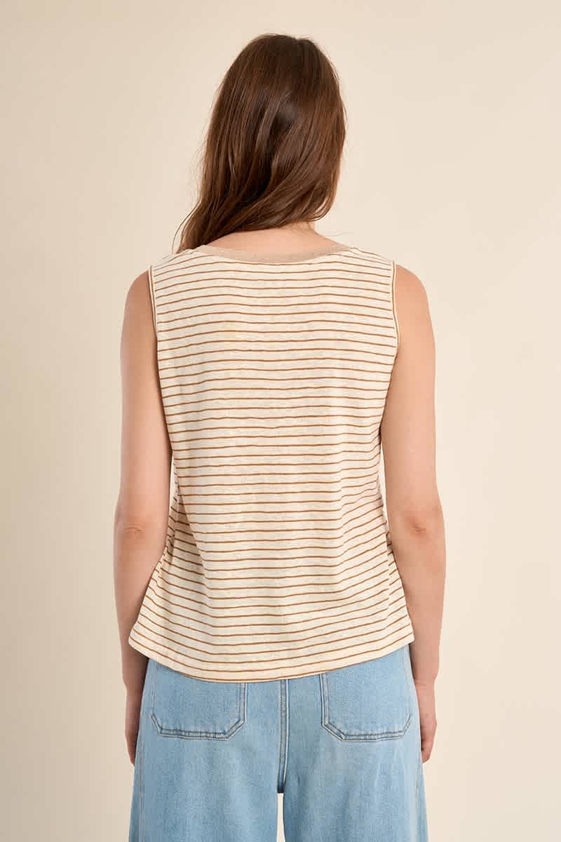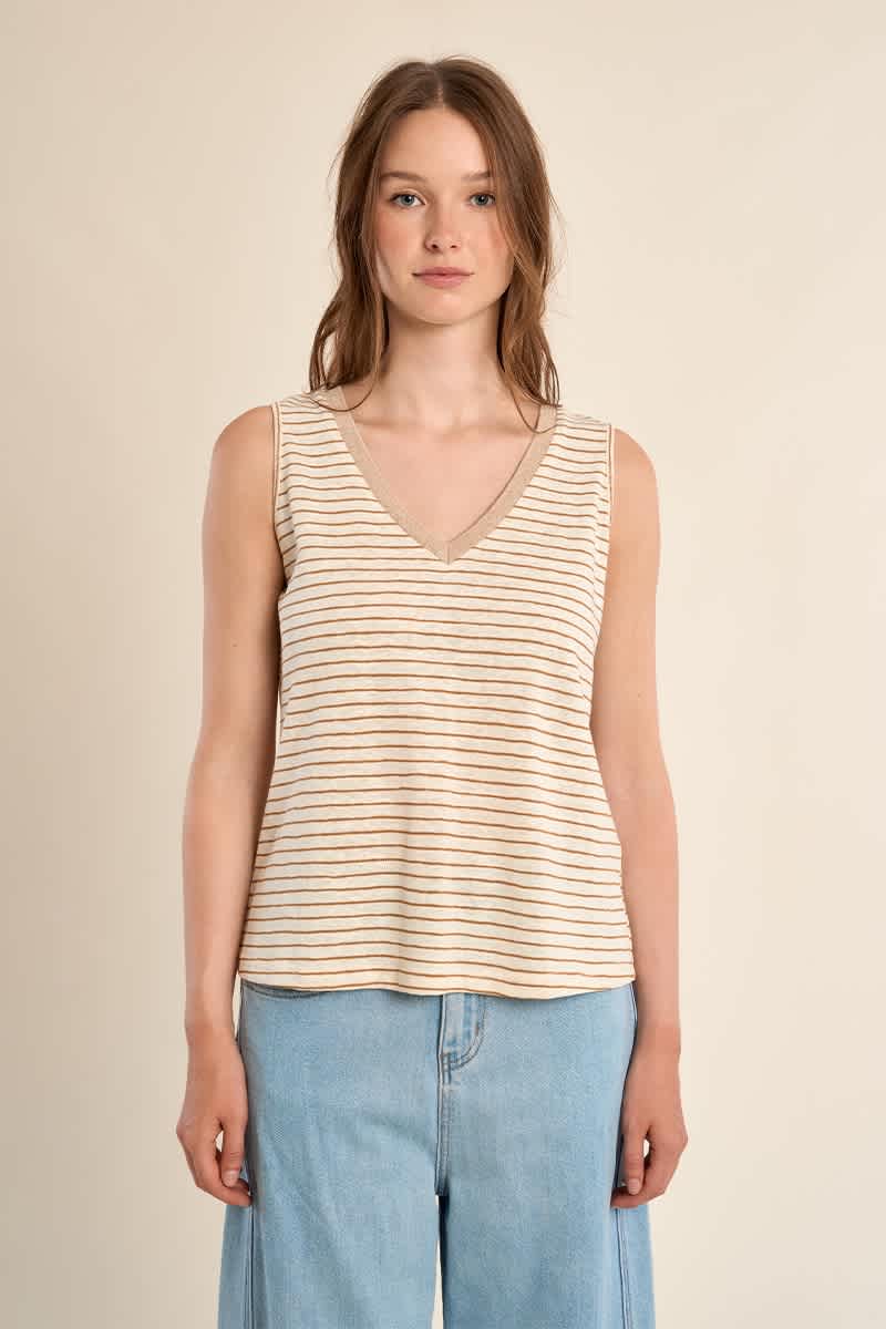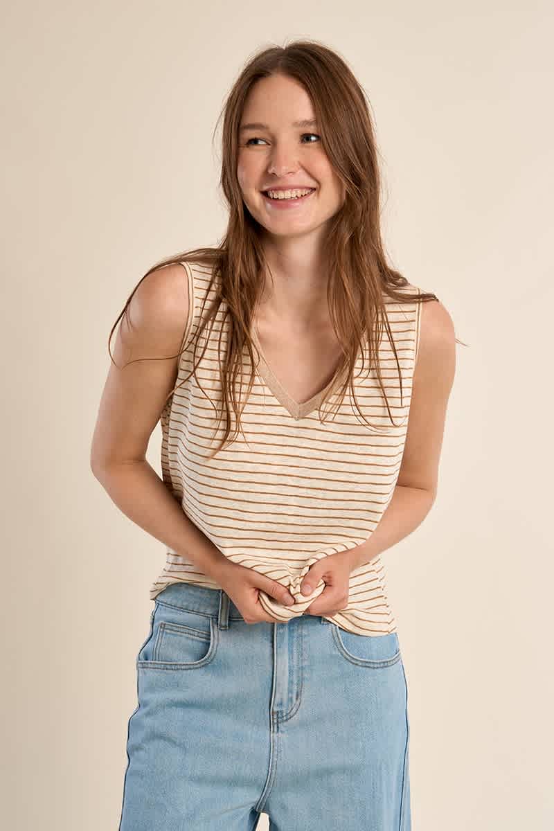 This V-neck tank top features stripes and a beautiful gold detail around the neck. The neutral colour of this tank makes it a must-have piece in your wardrobe this Summer. Wear with jeans or shorts and tan sandals.
