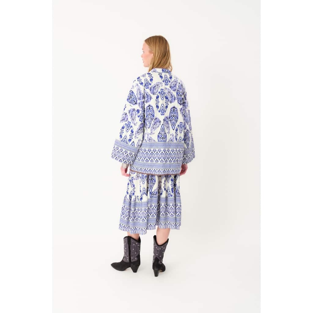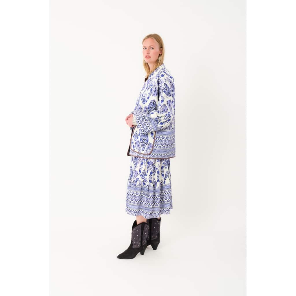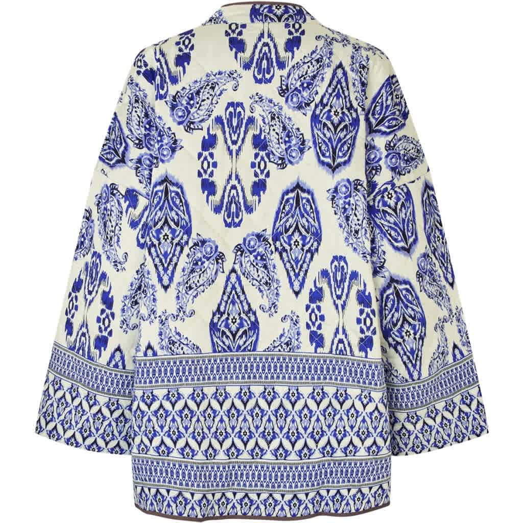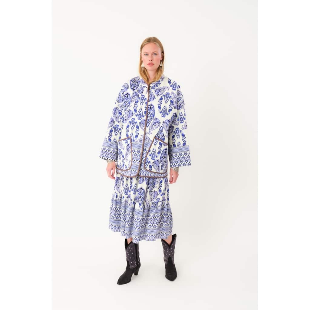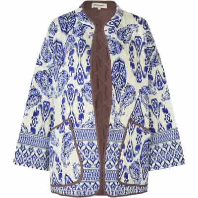 Blue and cream paisley patterned padded jacket with contrasting brown lining.