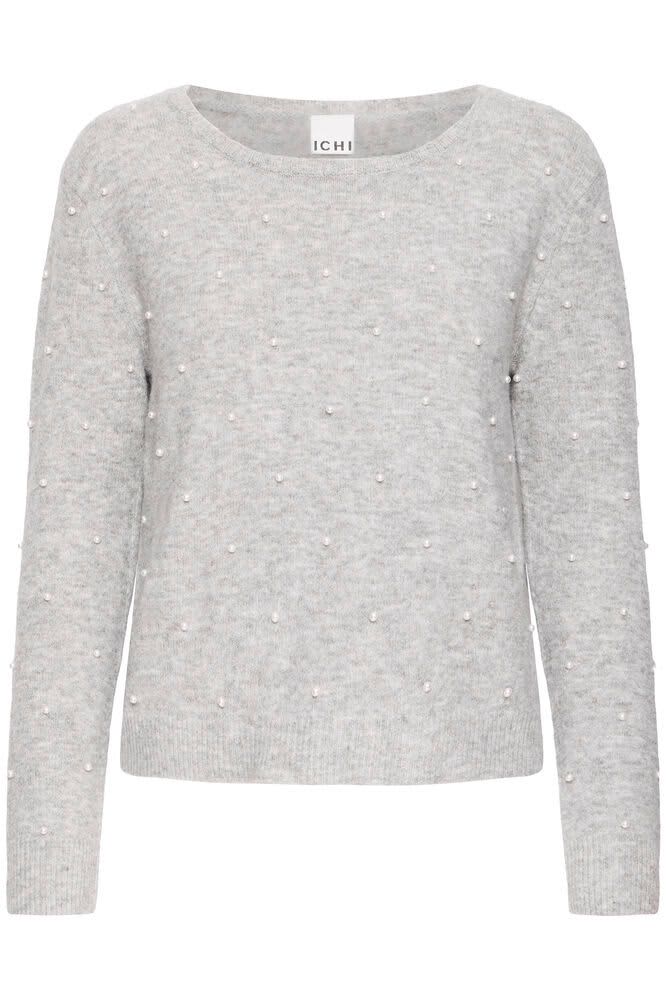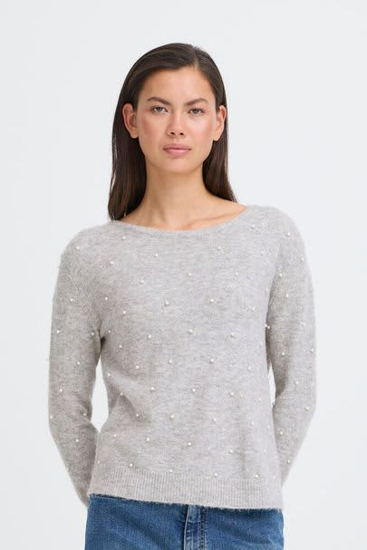 Light and cosy knit, with open round neck and long sleeves. This beautiful knit has pearls on the front and on the sleeves.