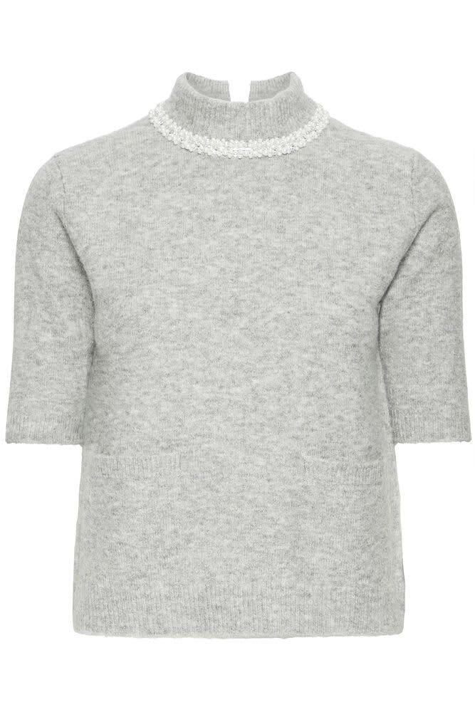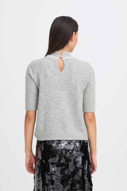 Short sleeve sweater features a straight silhouette, ribbed mock neck embellished with tonal beads, and practical front patch pockets. Soft brushed texture adds a cozy touch to this modern knit staple.