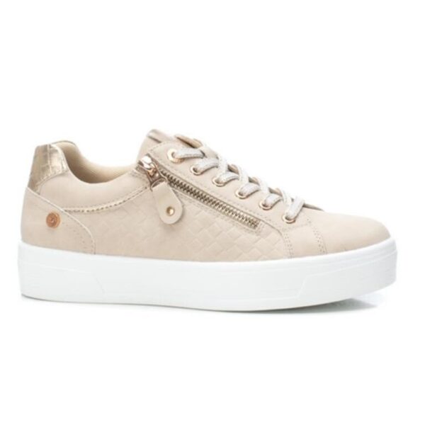 Beige faux leather trainers, with gold zip, gold detailing and gold trim on the laces. Trainers have XTIs “Comfort Tech. Optimal wearing comfort thanks to our really soft footbed, that adjusts itself to your foot”.