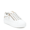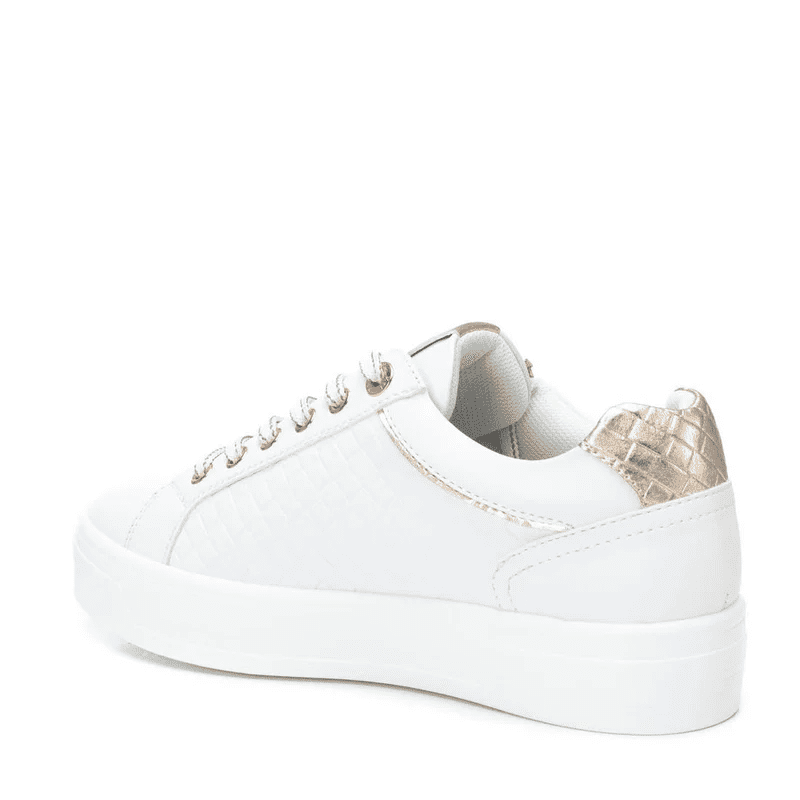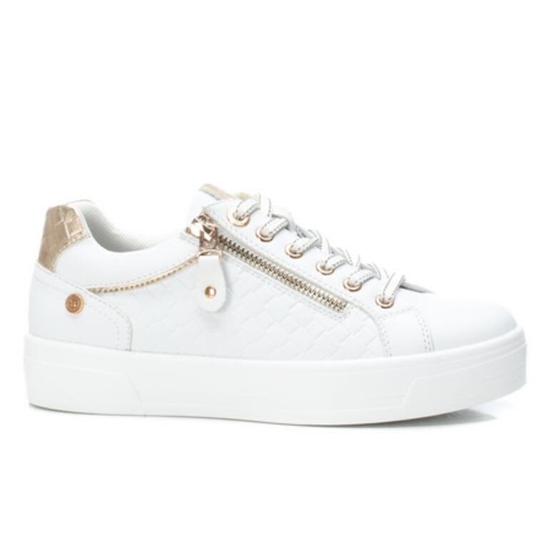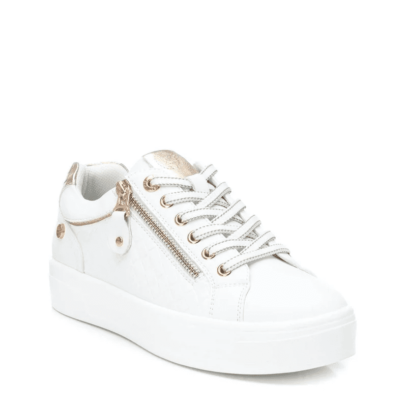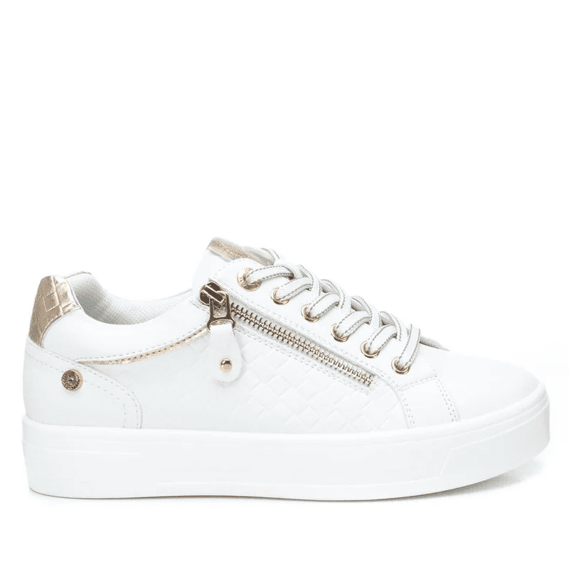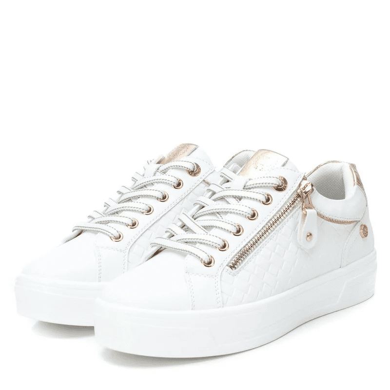 White faux leather trainers, with gold zip, gold detailing and khaki trim on the laces. Trainers have XTIs “Comfort Tech. Optimal wearing comfort thanks to our really soft footbed, that adjusts itself to your foot”.