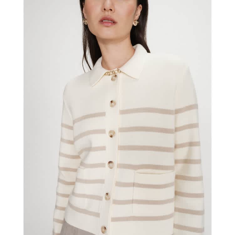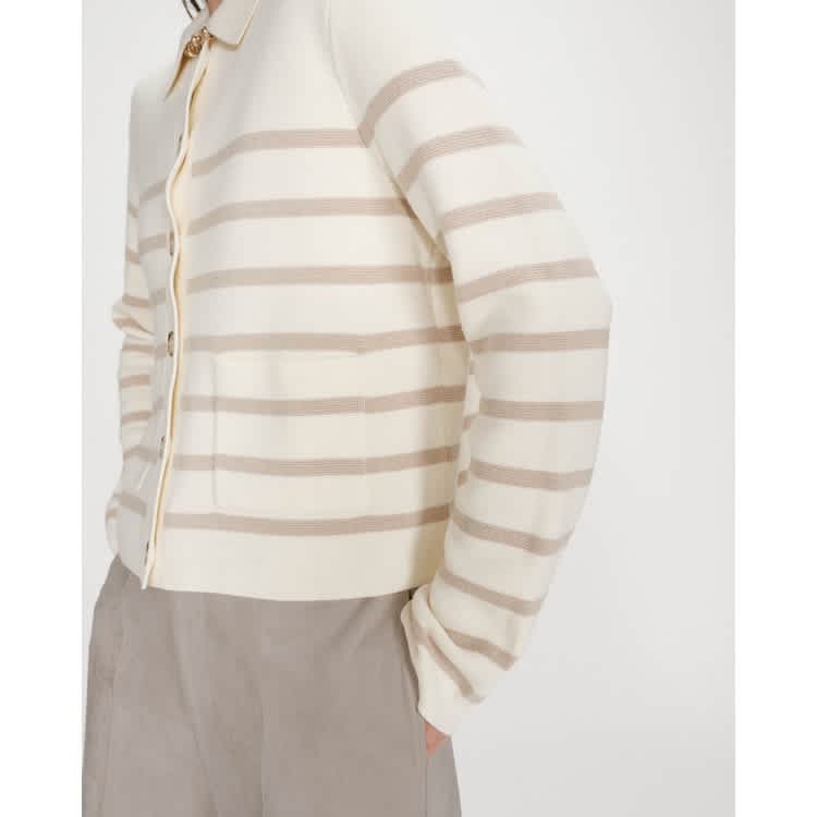 Button down front knit vanilla cardigan with taupe stripes and front pockets.