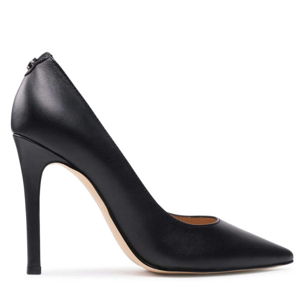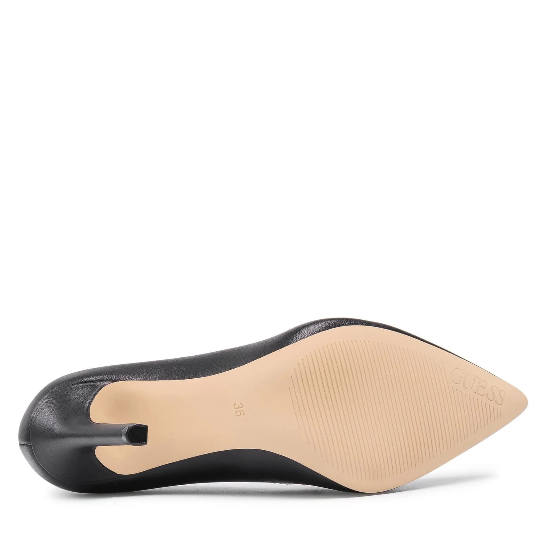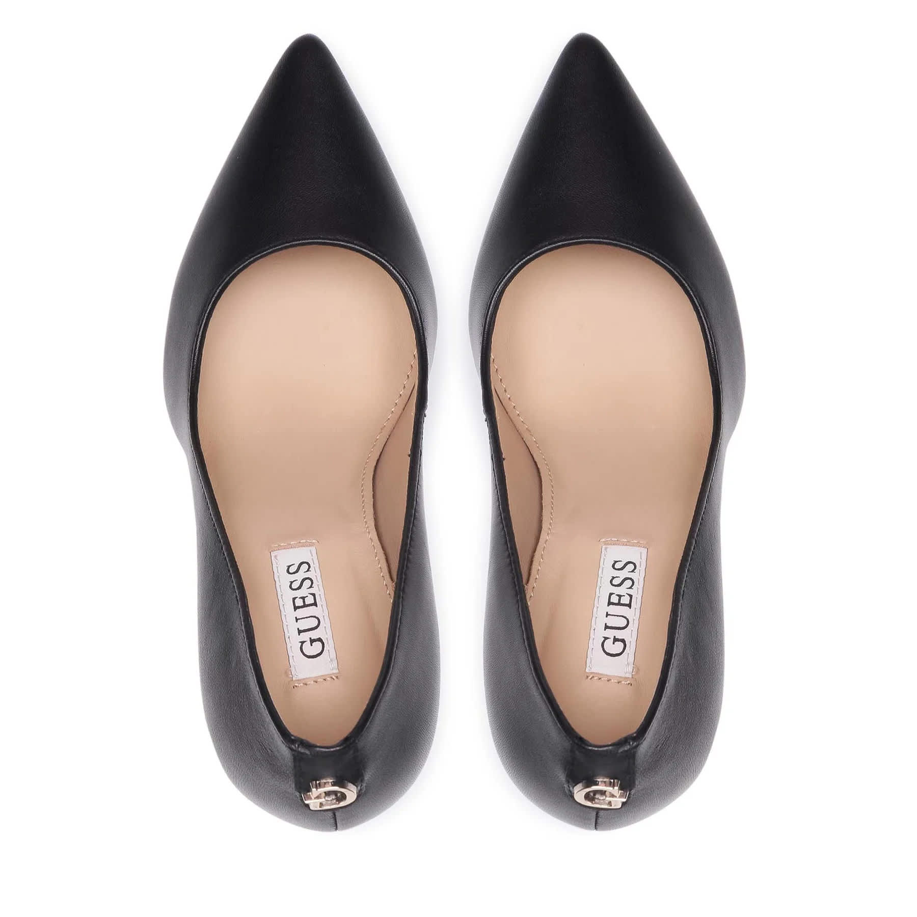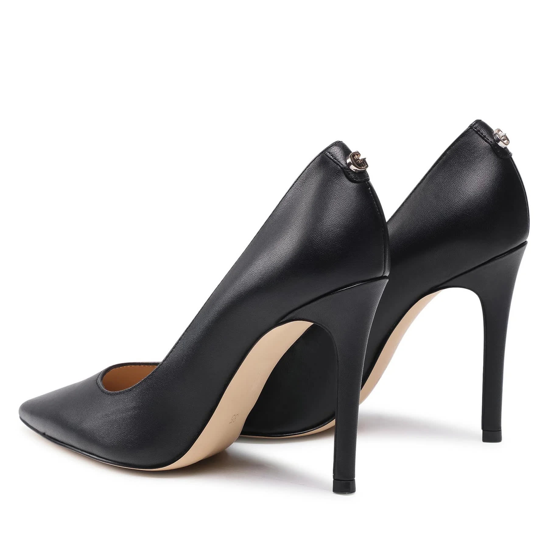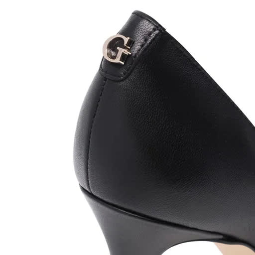 Beautiful, classic black leather court shoe with pointed toe and silver G on the back heel.