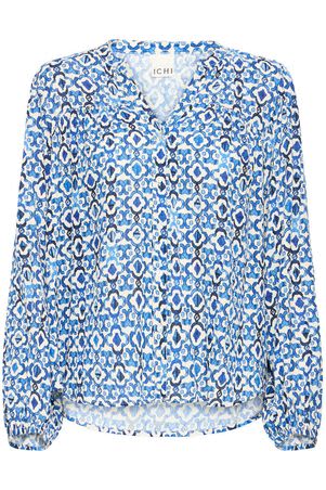 This blue printed shirt features a button down front with a grandad collar and a V-neck. The sleeves are long with an elasticated cuff and a slightly ruched shoulder giving a lovely silhouette. This shirt is a relaxed fit and matches the Kos Wide Leg Trousers.
