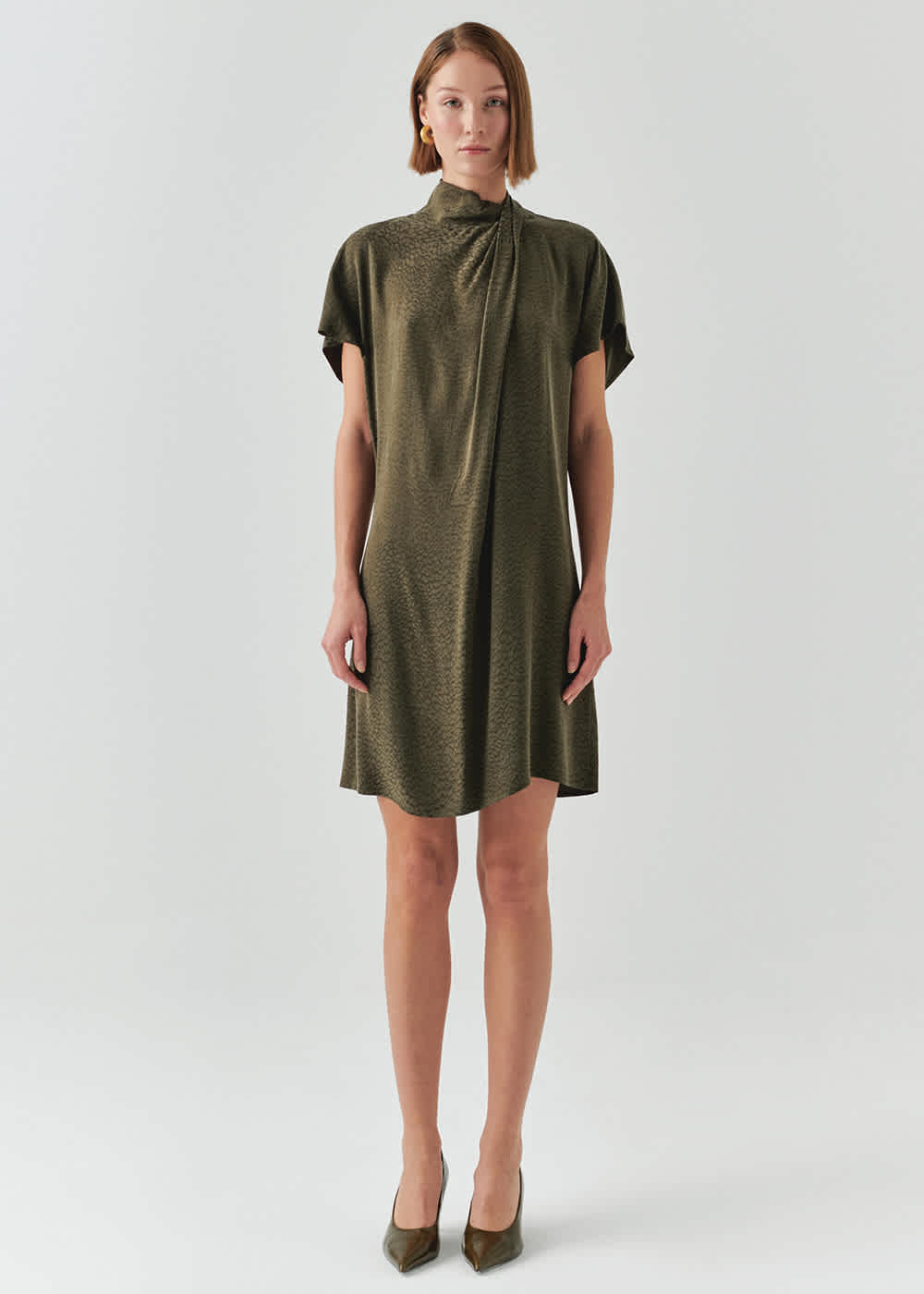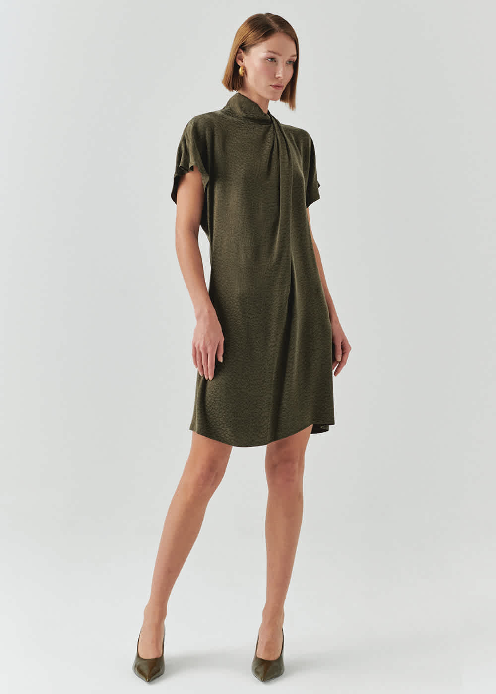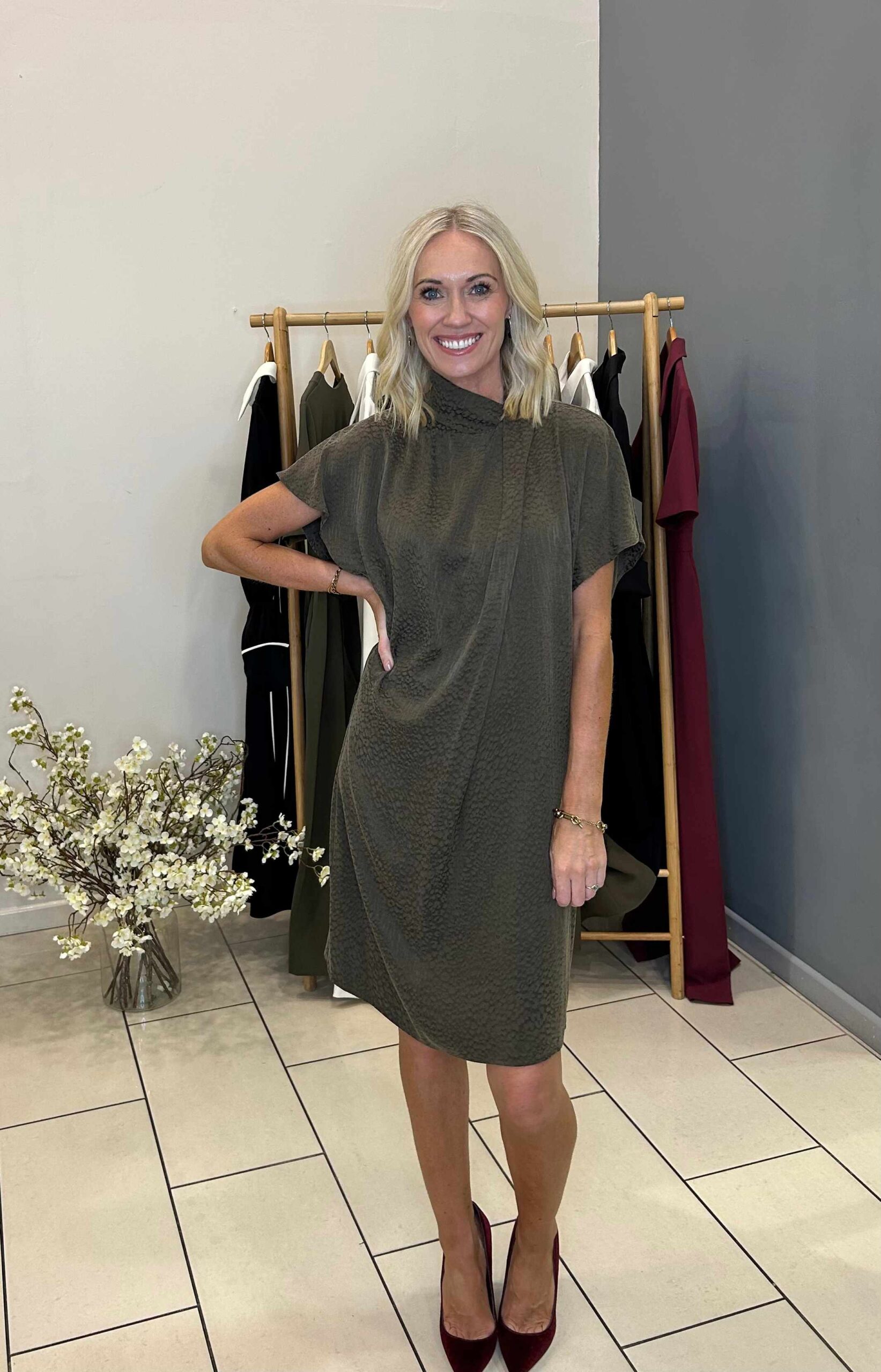 The fabric and comfort of this dress is the beauty. A cupro silk blend fabric. Simple, luxurious and timeless. Draped neckline feature. Relaxed fit.