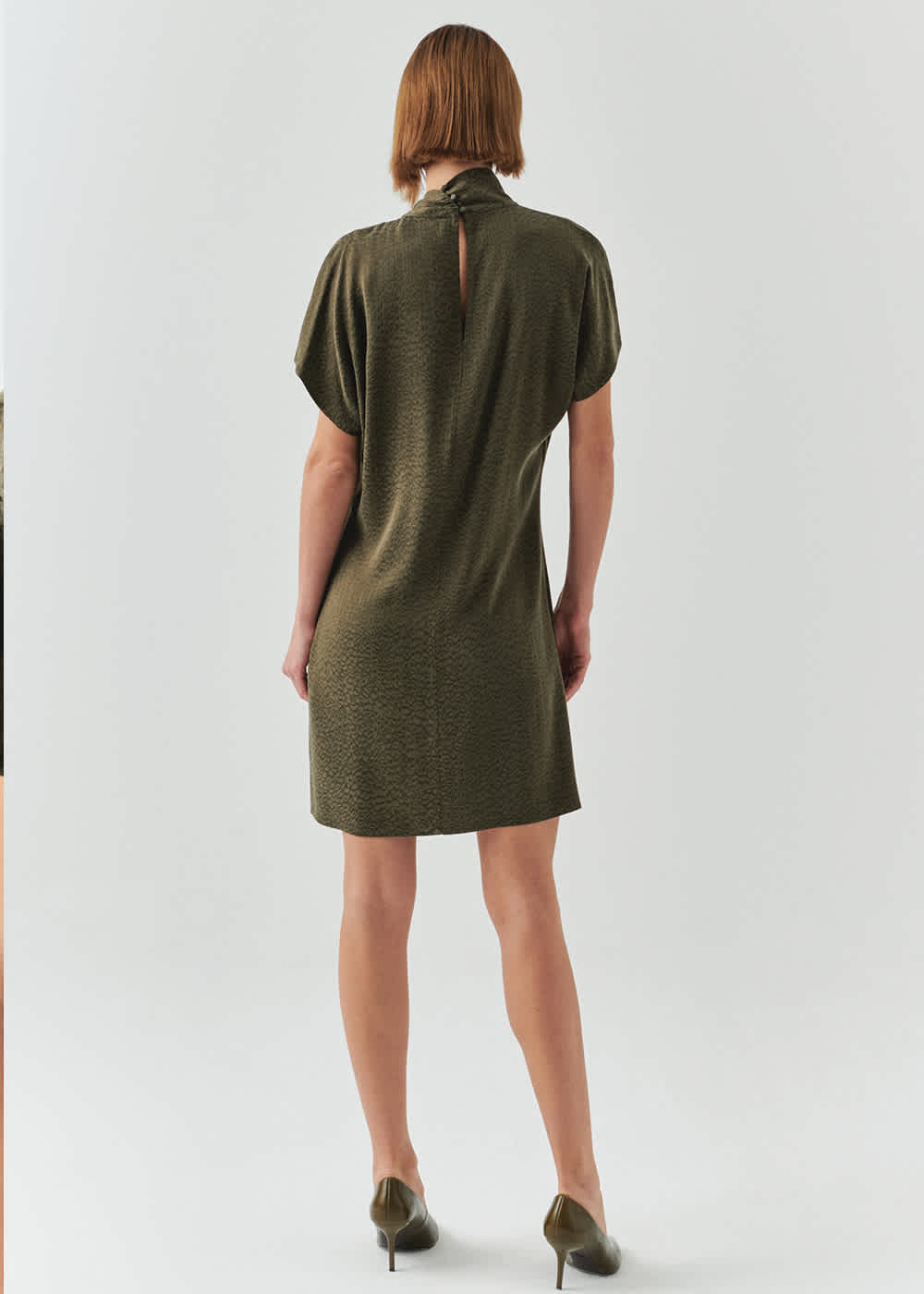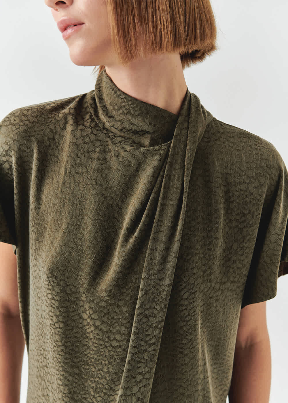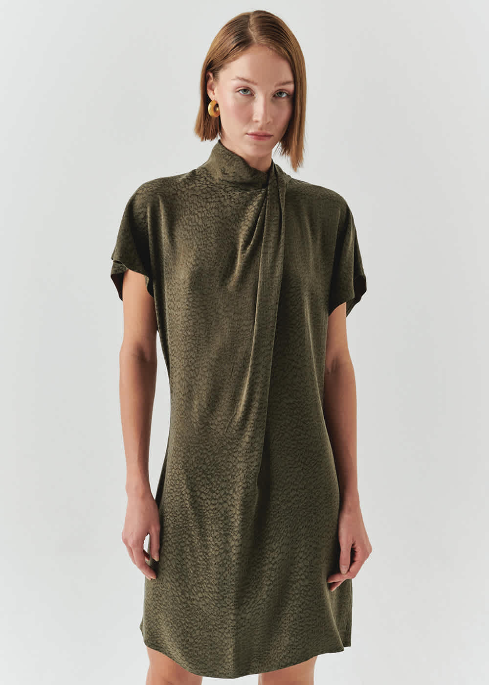 The fabric and comfort of this dress is the beauty. A cupro silk blend fabric. Simple, luxurious and timeless. Draped neckline feature. Relaxed fit.