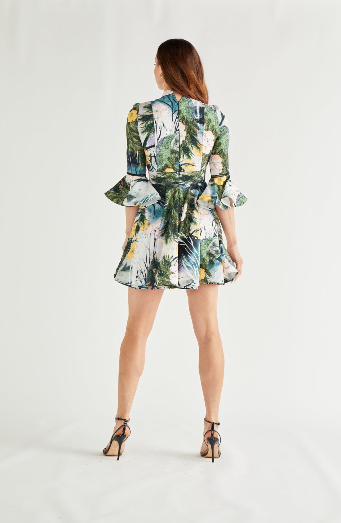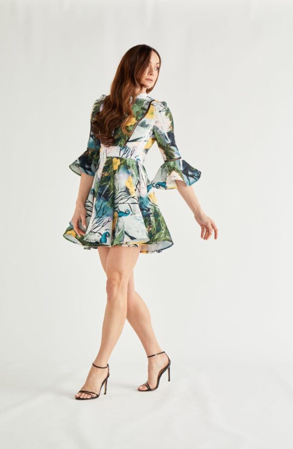 Say hello to the hues of Autumn with the Mary Jayne mini dress in the incredible Porcelain Peacock print.