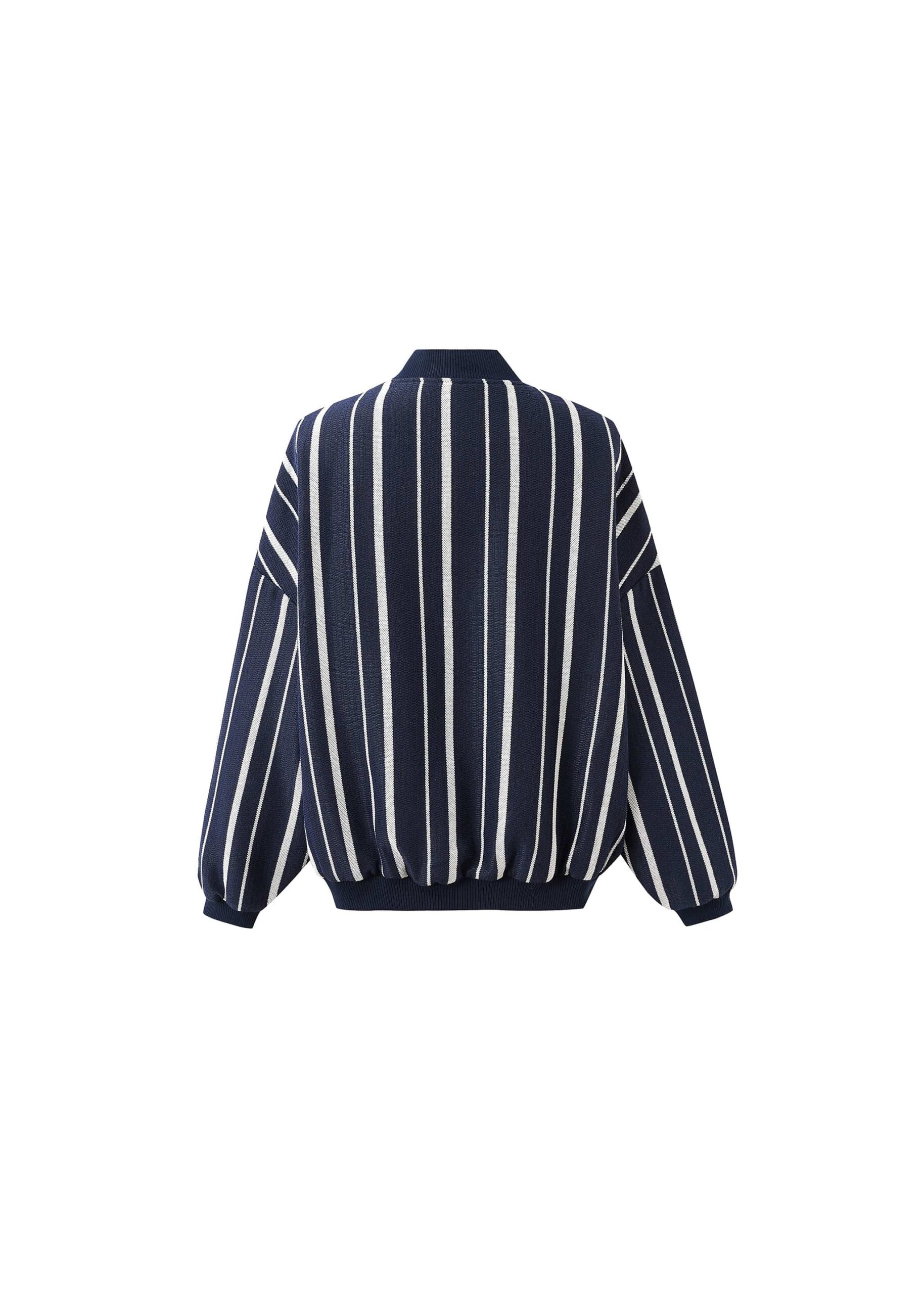 Woven stripe padded navy bomber jacket with white stripe and zip down front.