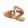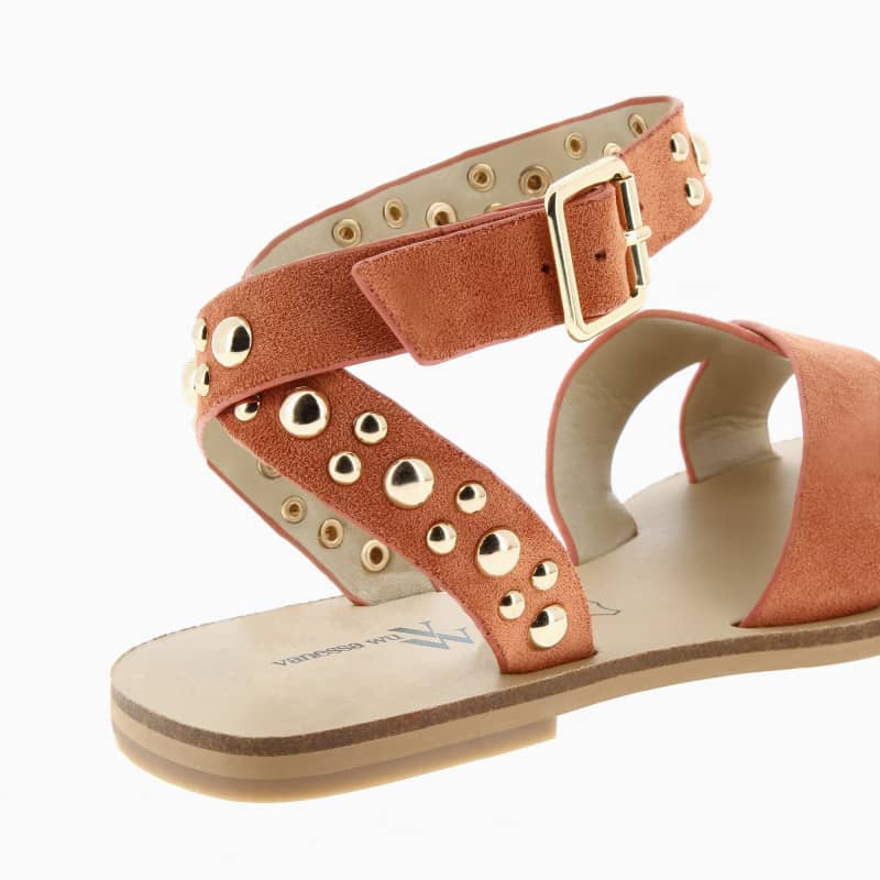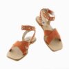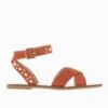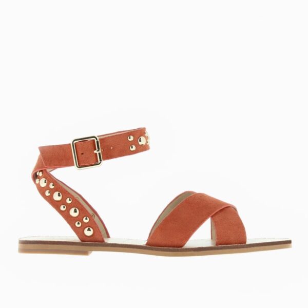 Brick red suedette sandals. Crossover straps at the front. Adjustable ankle strap with gold studs. Gold buckle closure. Square toe.