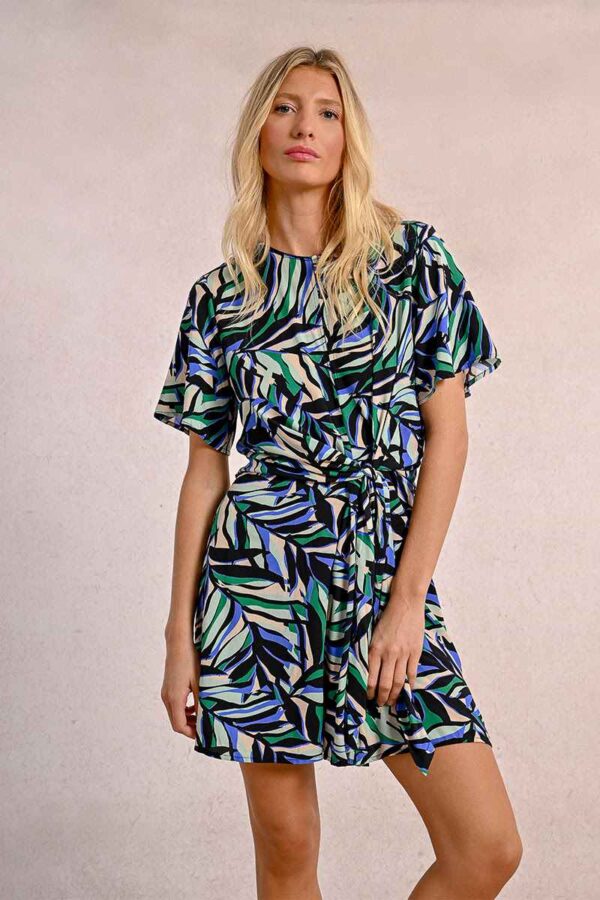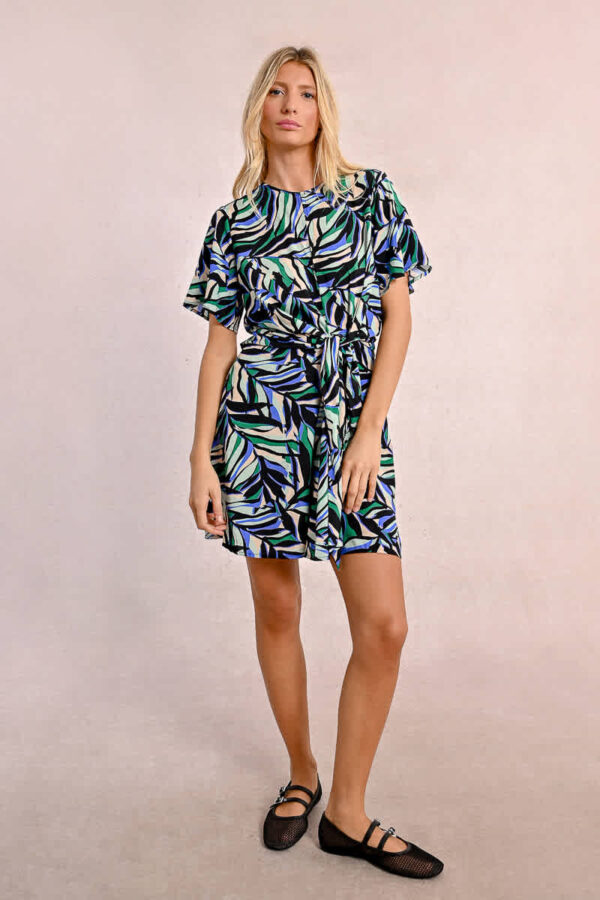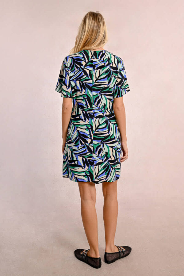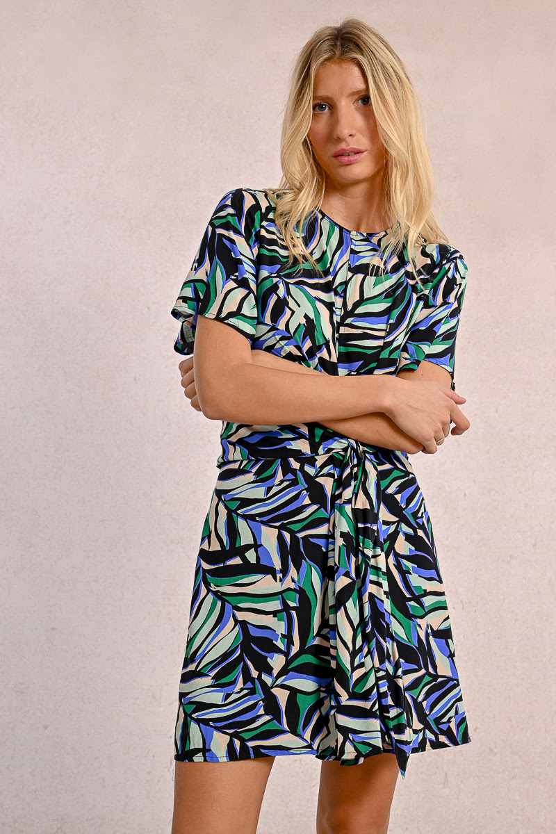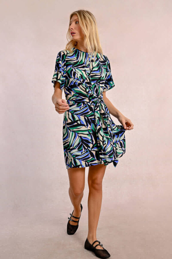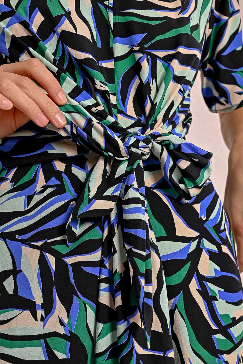 This short sleeved printed dress features a round neck with a keyhole on the chest revealing a small bit of skin. It ties at the waist to add a ruched effect making the silhoette very flattering. It closes with a hidden zip to the back of the neck and sits nicely on the knee. Wear with flat sandals or dress up with a heel.