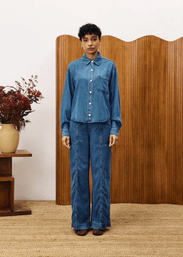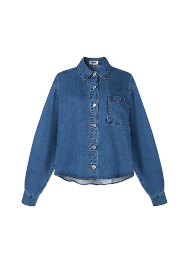 Soft denim shirt with silver buttons down the front, long sleeves and single pocket on the front.
