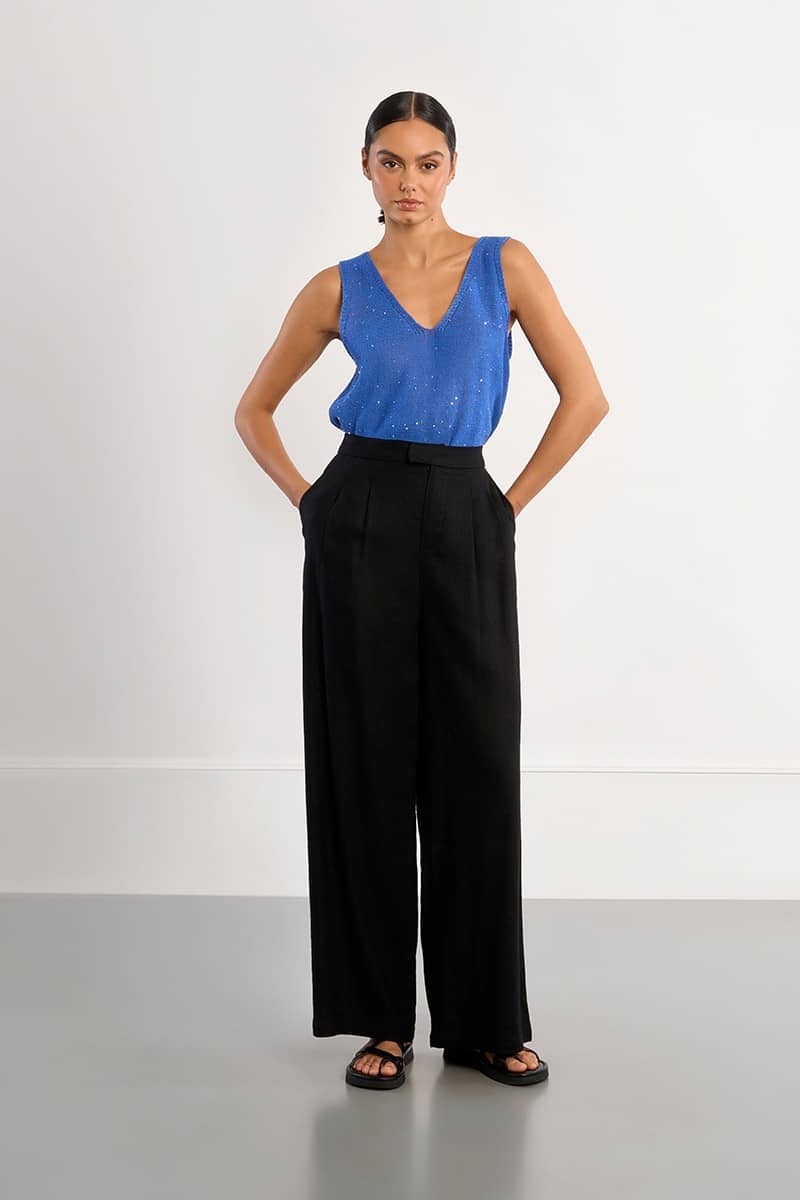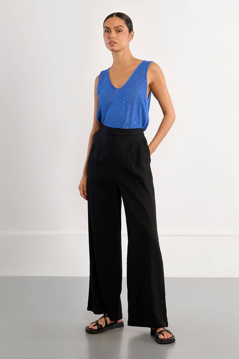 These part linen black trousers are a must-have in your Summer wardrobe. They feature a hidden zip with a button and clasp closure. These trousers are high waisted and have pockets to the front and a faux welt pocket on the back. Wear with a fitted tee and sandals or trainers on a nice day.