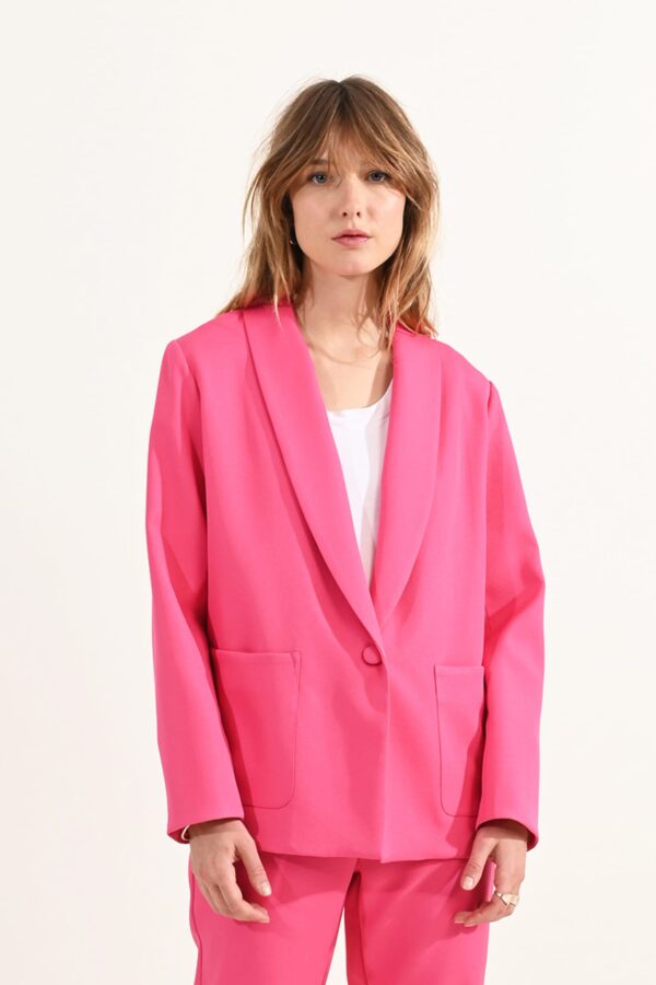 Stunning hot pink suit jacket with tuxedo collar and patch pockets. Single button closure and loose fit. An excellent addition to complete your outfit this summer or match it with the Melody Shorts.