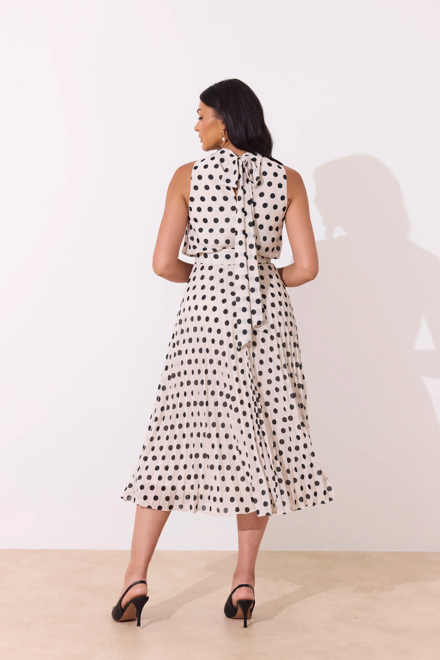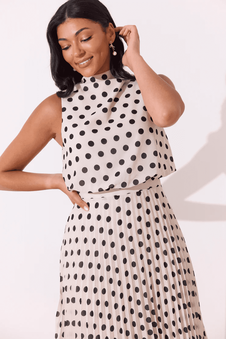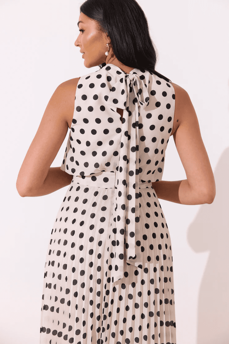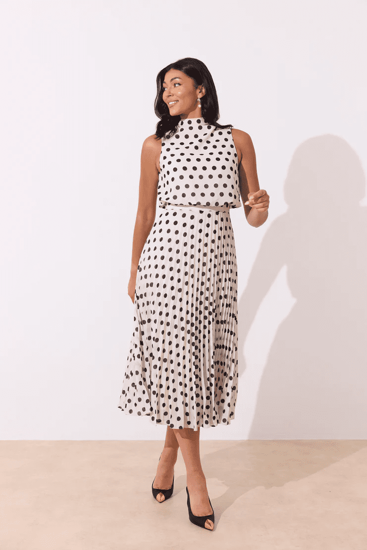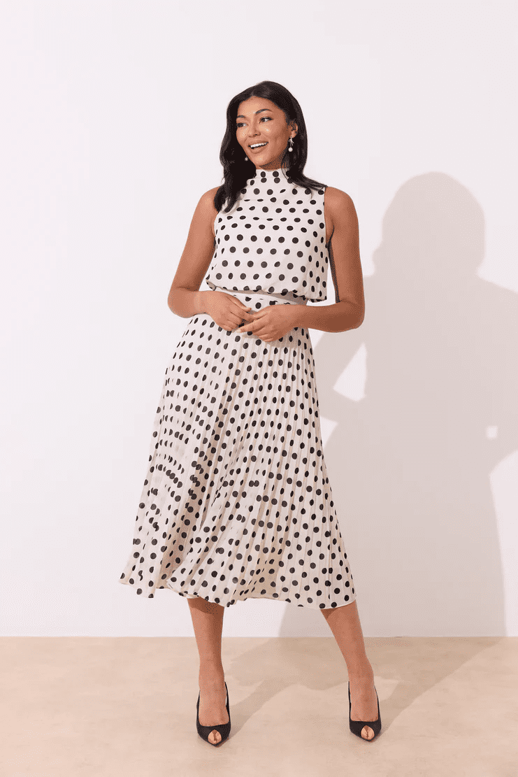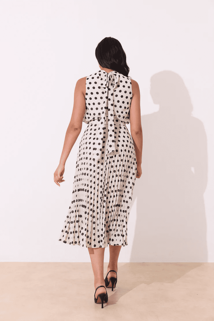 The Milly pleat dress is SO perfect for now!! On trend in the beautiful black & white polka dot print, this dress pairs easily with your favourite neutral accessories – and would look stunning styled with a vintage-feel hat for the Races or a special Wedding.