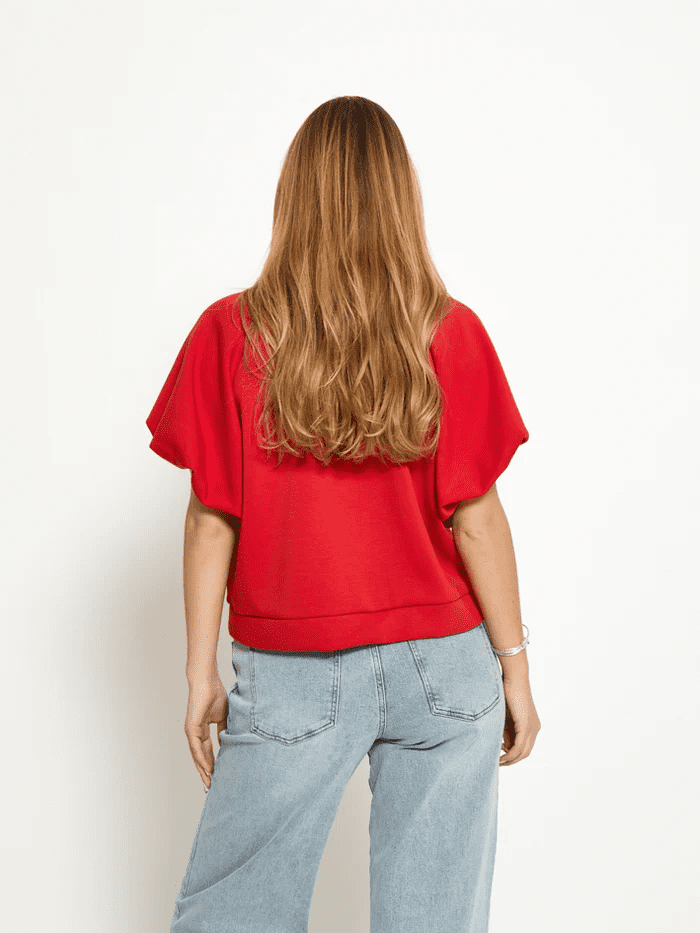This V-neck top features a balloon sleeve with an elasticated cuff. The sleeve is short and the fit is relaxed. The fabric is beautiful and soft making this top a luxury to wear. Wear with matching pants or jeans for a pop of colour.
