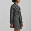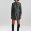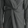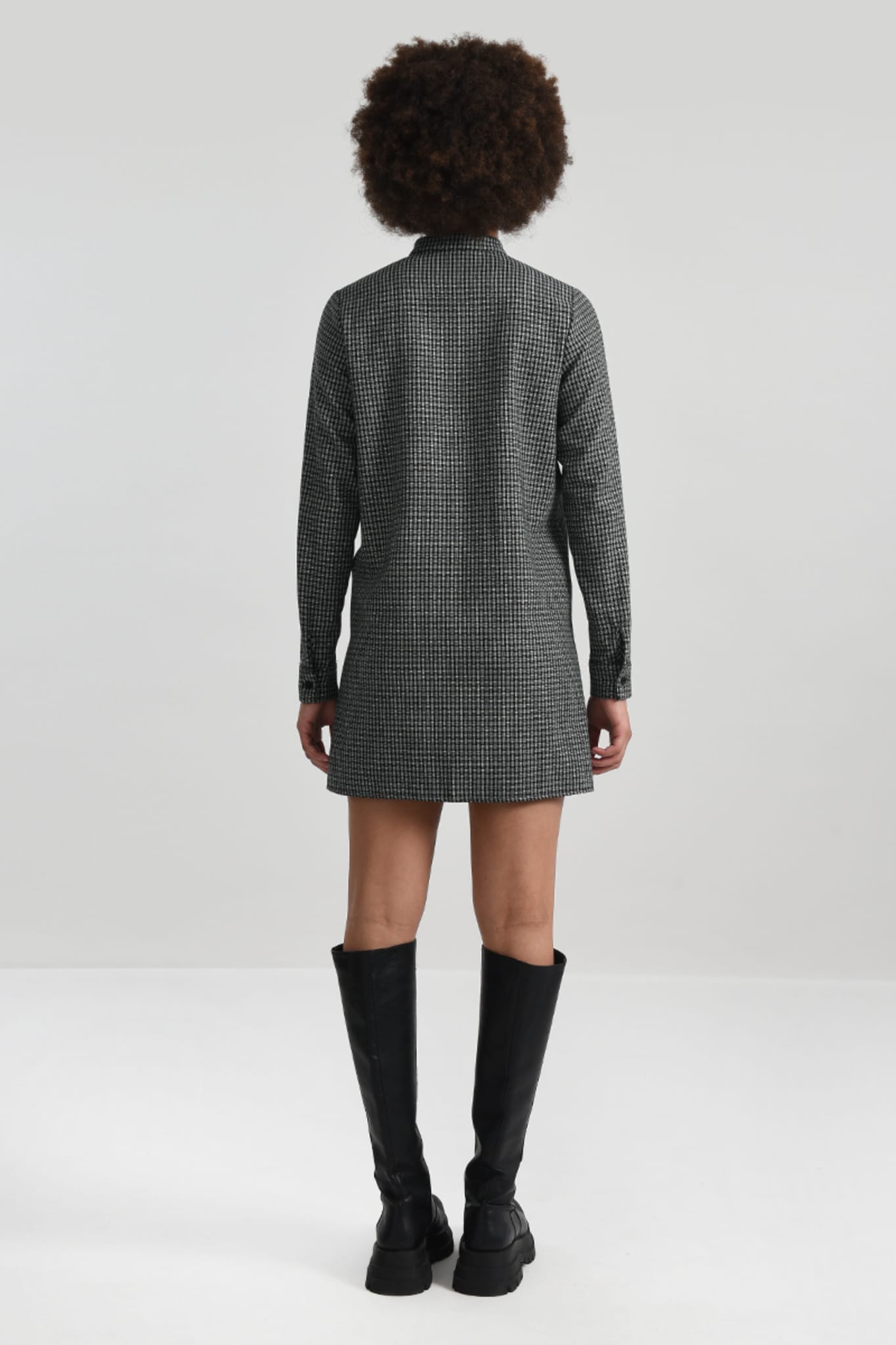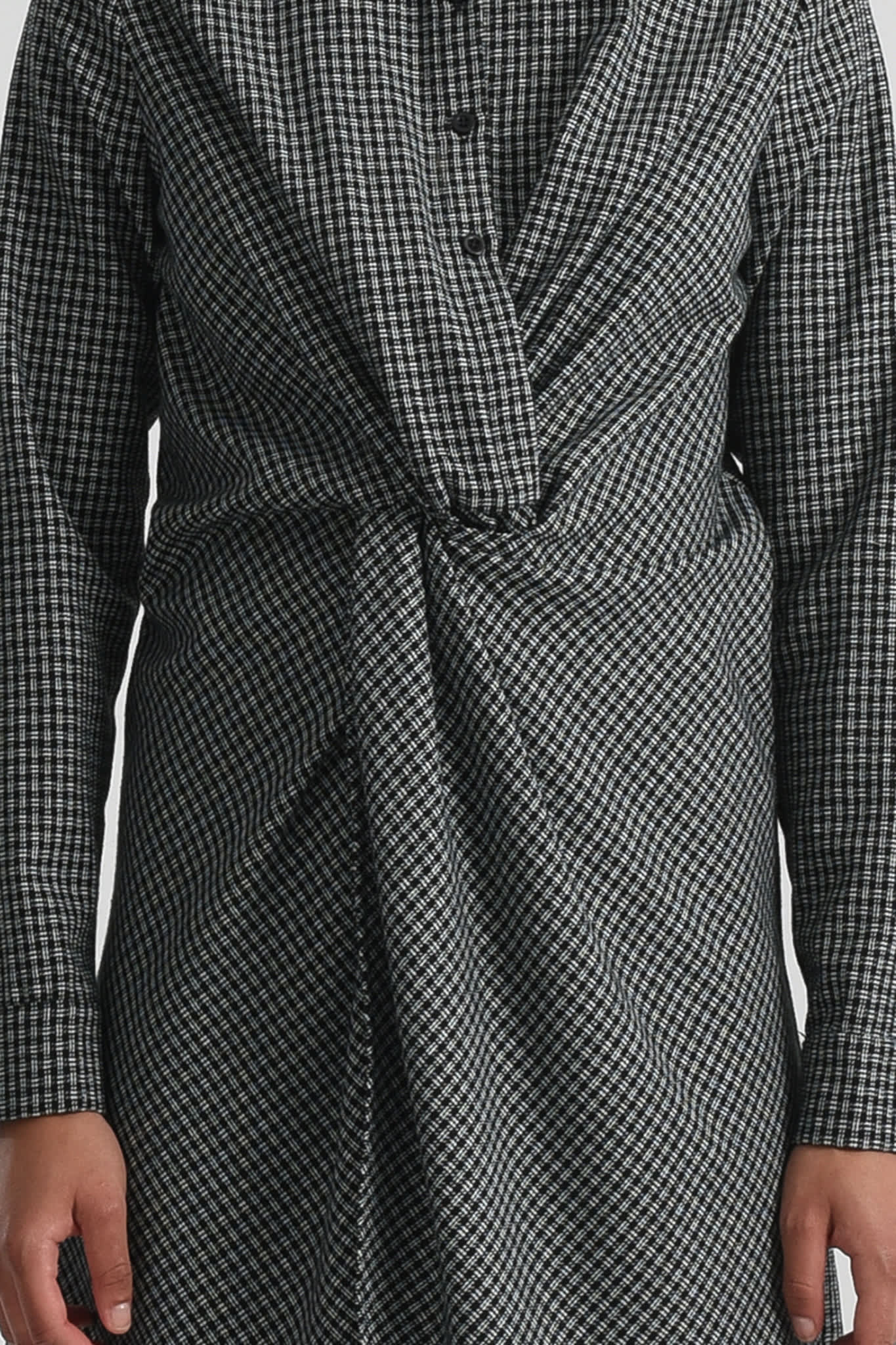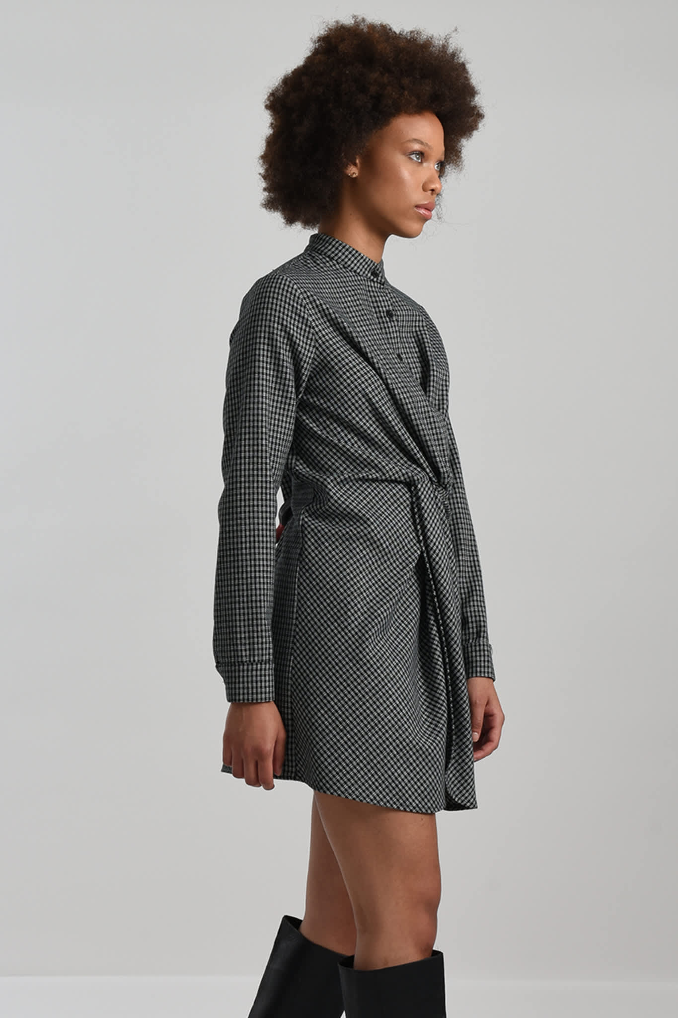 Straight dress buttoned on the top, checked pattern, twist on the front and draped waist.