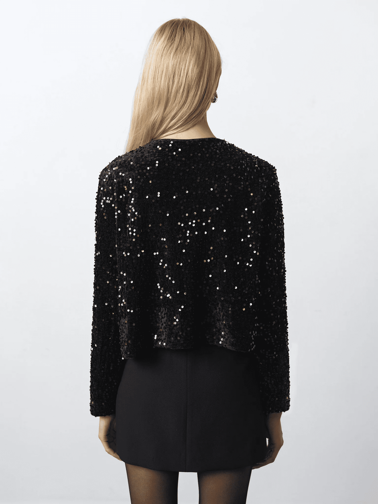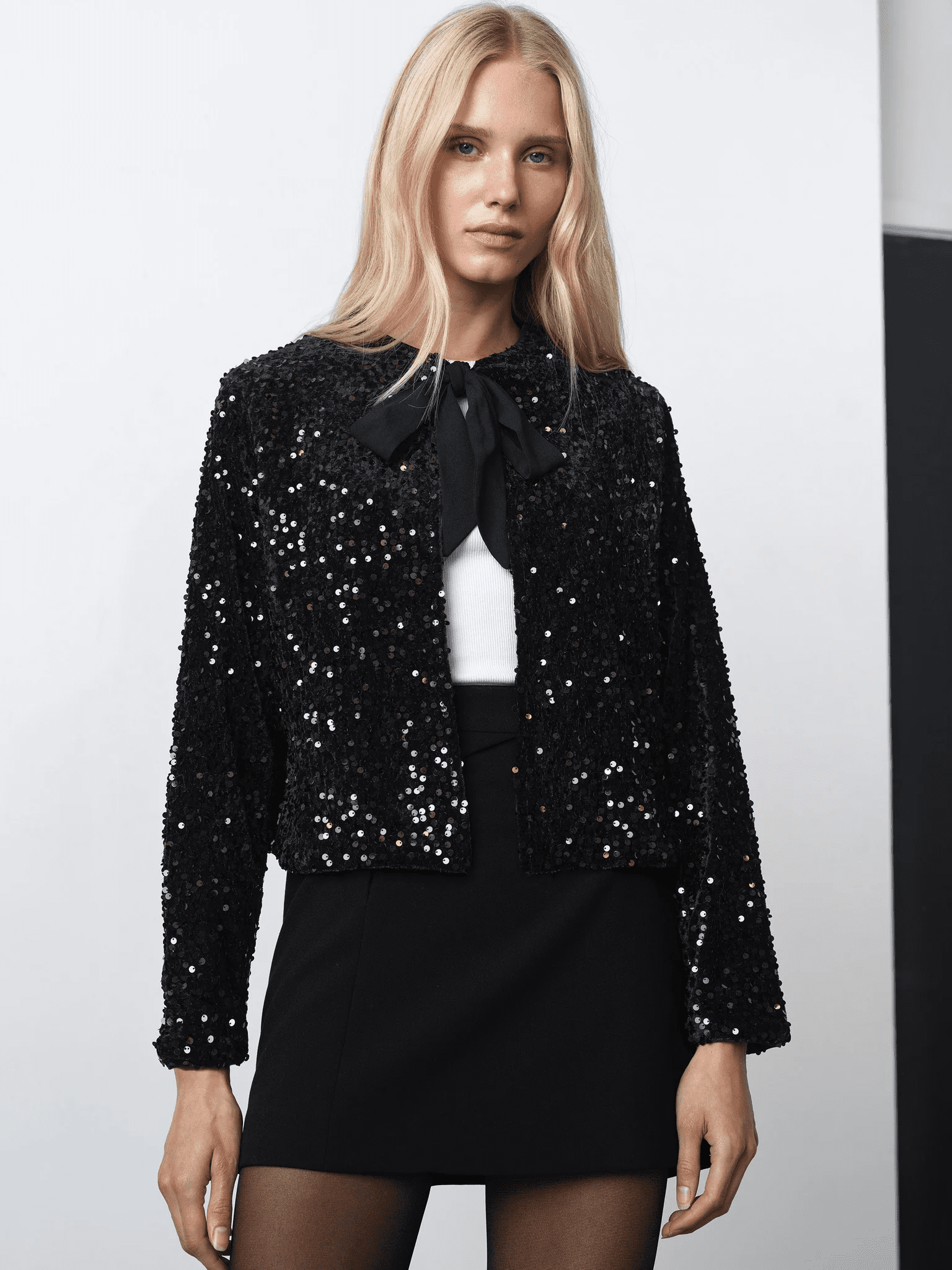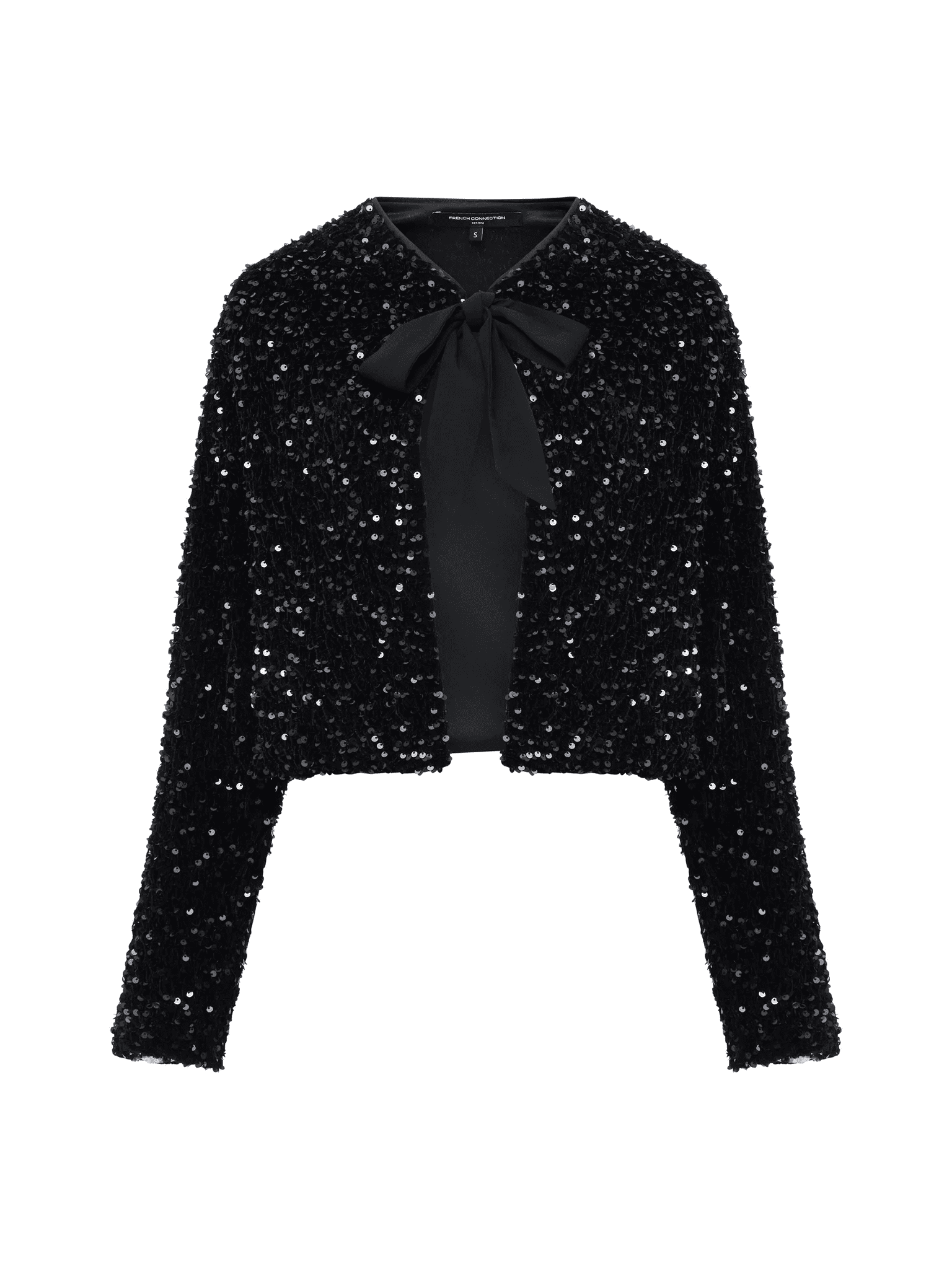 This monet sequin bow tie cardigan gives vintage glamour a shimmering update. This cropped cardigan features long sleeves and all-over sequins, accompanied by a statement self-tie neck bow. Fully lined. Perfect for the Christmas season.