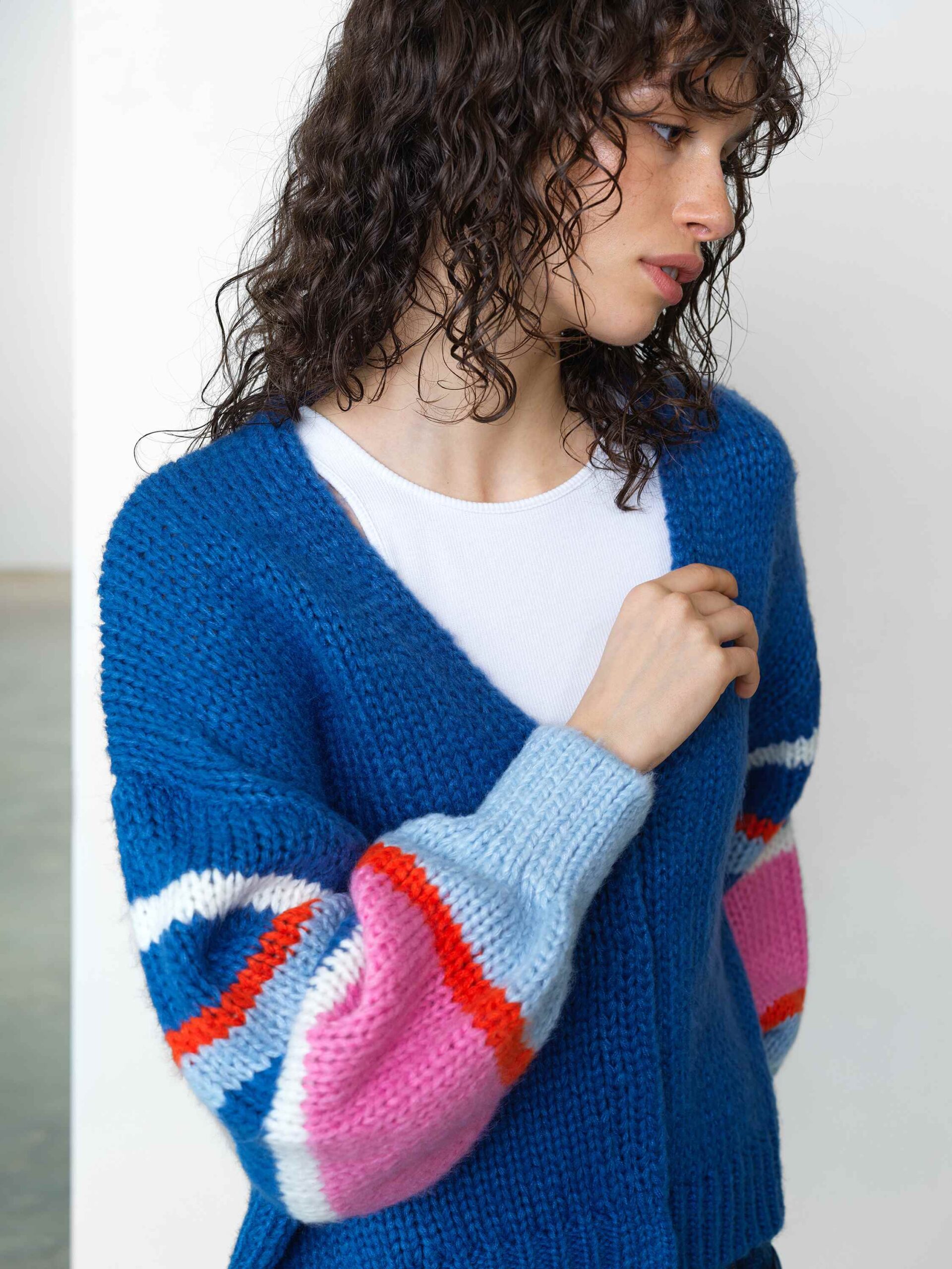 Colour meets comfort with our Monroe Colour Striped Sleeve Cardigan. This chunky knit cardigan stands in a cropped silhouette featuring boldly striped balloon sleeves and concealed popper fastenings.