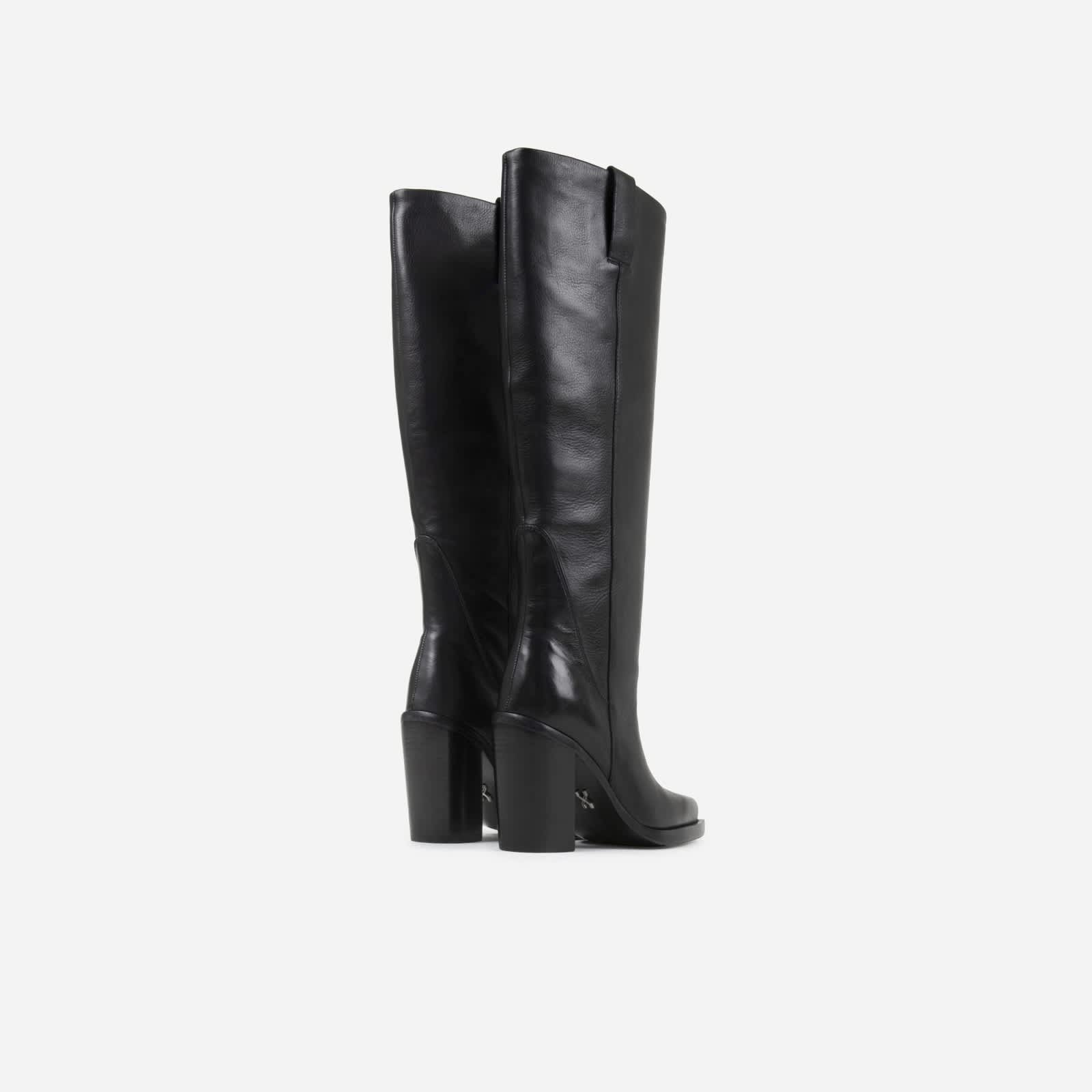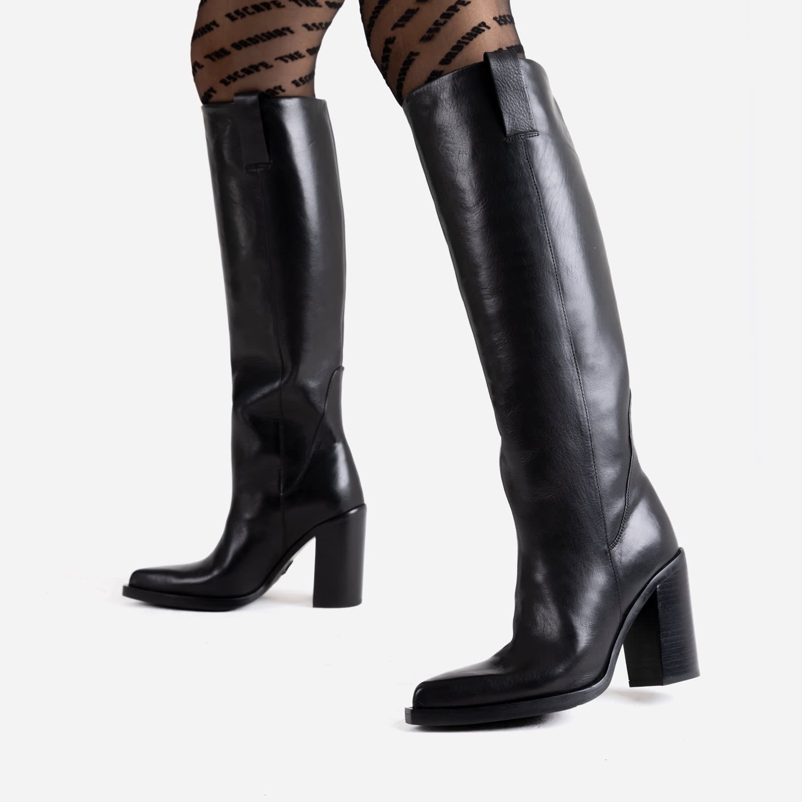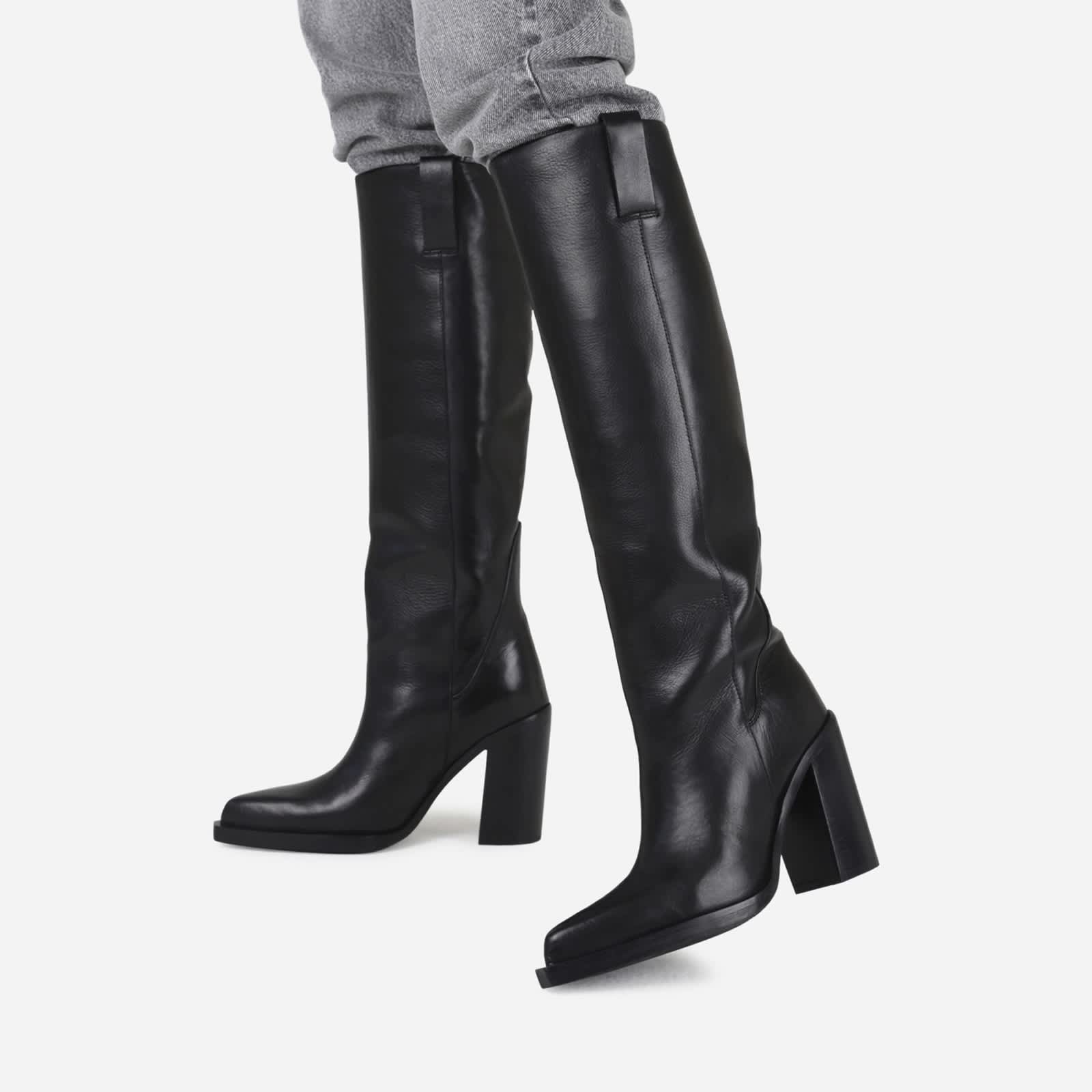 These boots are made for walking! This high boot is a real eyecatcher. The boot has a 10 cm heel and is shiny black which gives you that clean look. This boot can be a bit tighter around the calf.