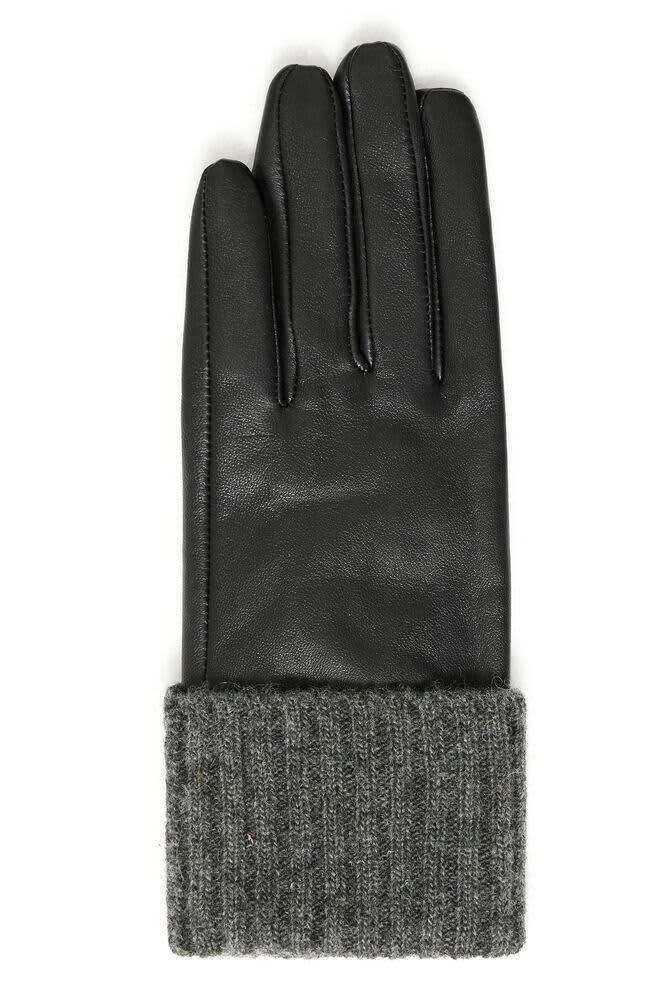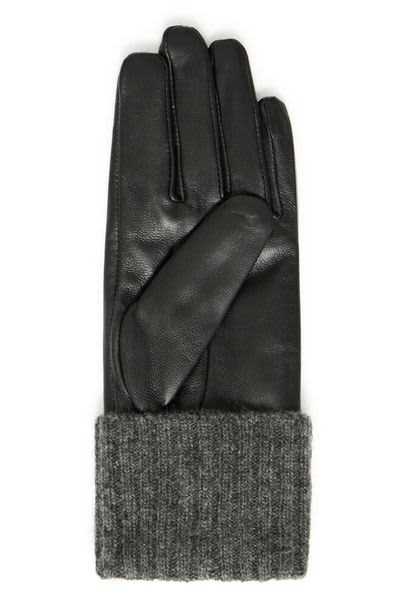 These black gloves feature a smooth, structured exterior with distinct stitching and a ribbed knit cuff for a streamlined fit. The tailored silhouette and textured cuff detail deliver an effortlessly refined look with modern appeal. Great gift idea.