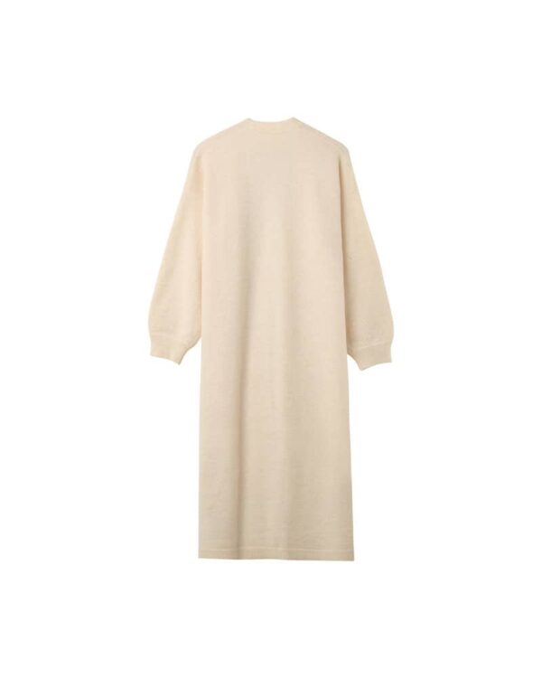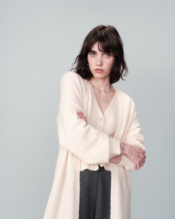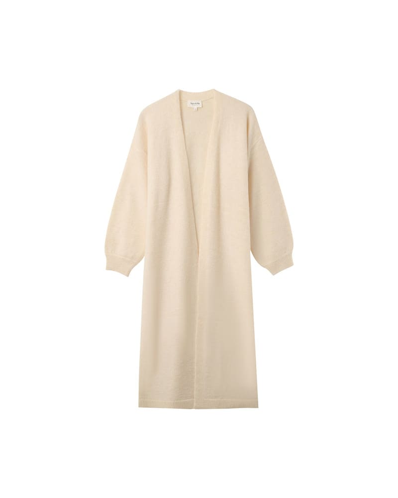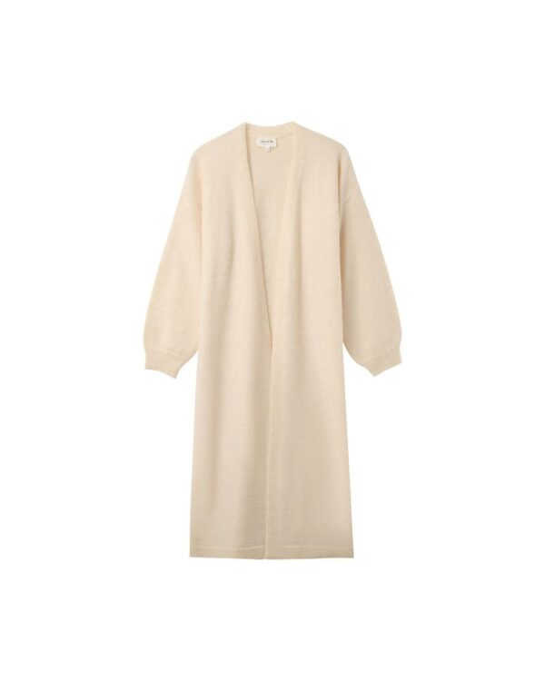 This long open cardigan in cream features long sleeves and a wide cut. It is partly made from mohair wool to give a soft and delicate touch. Perfect to integrate into Autumn/Winter.