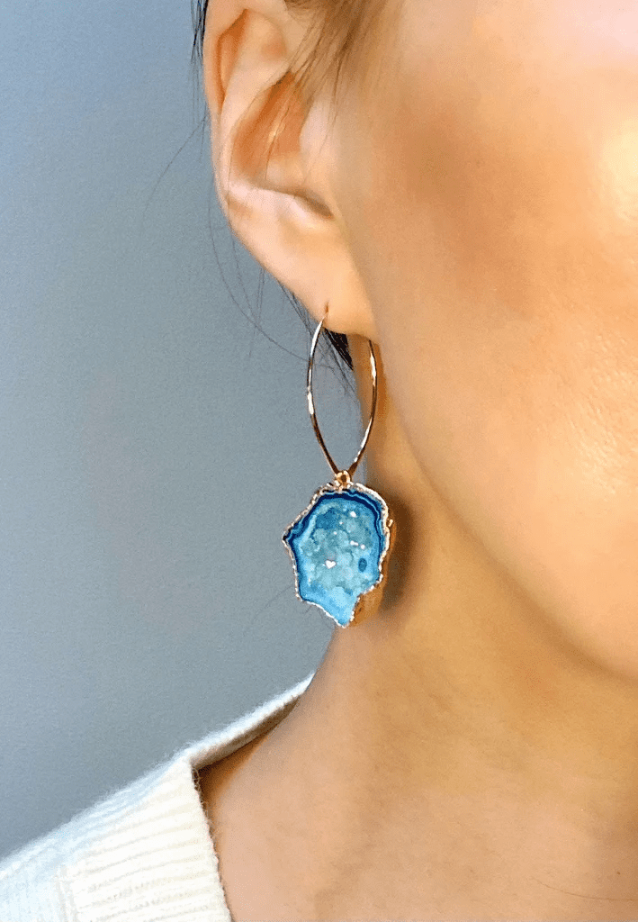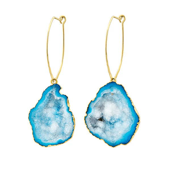 Nebula earrings are hand made with the most beautiful aqua blue geode agate slices electroplated in 24 k gold and set on 24 k gold plated brass.  Simple and classic design, lightweight.