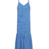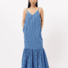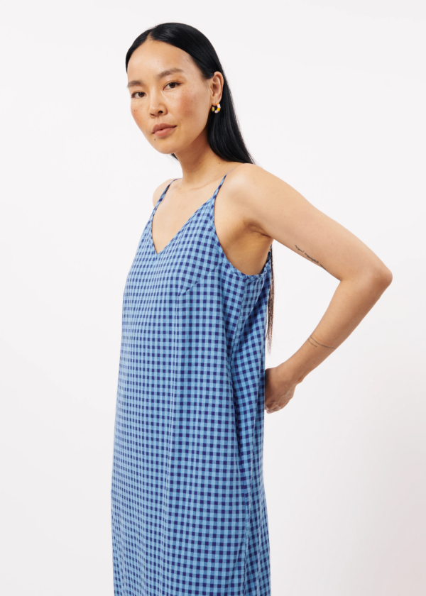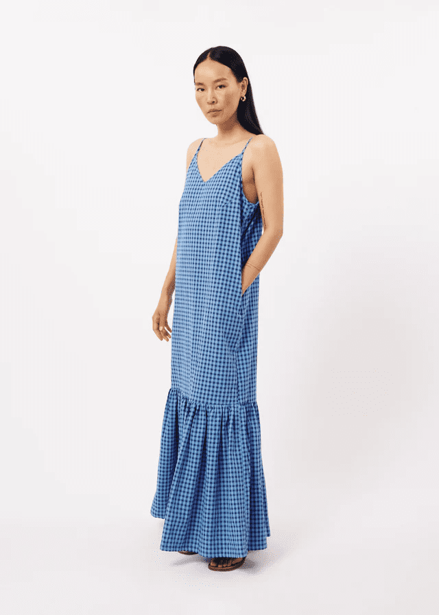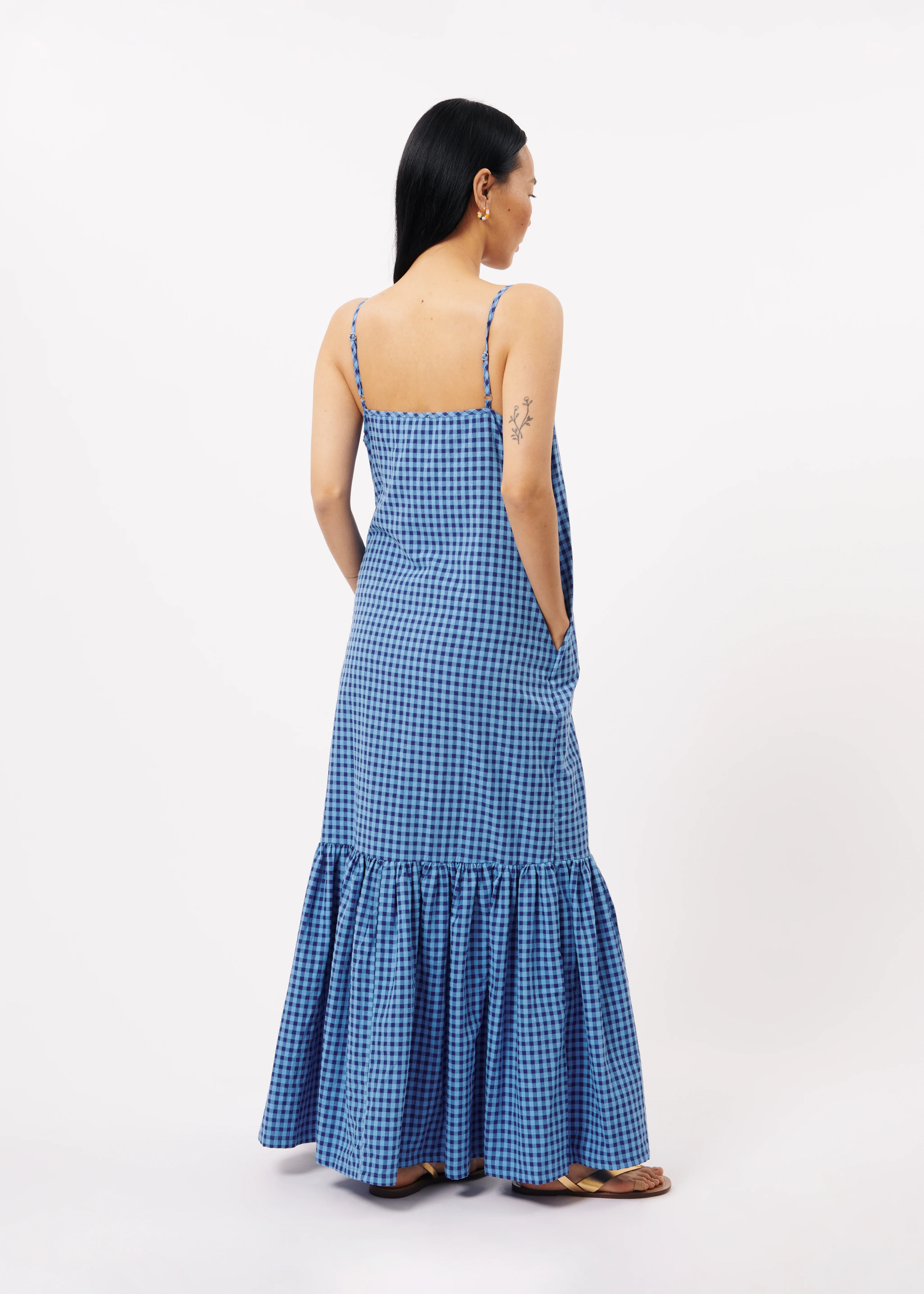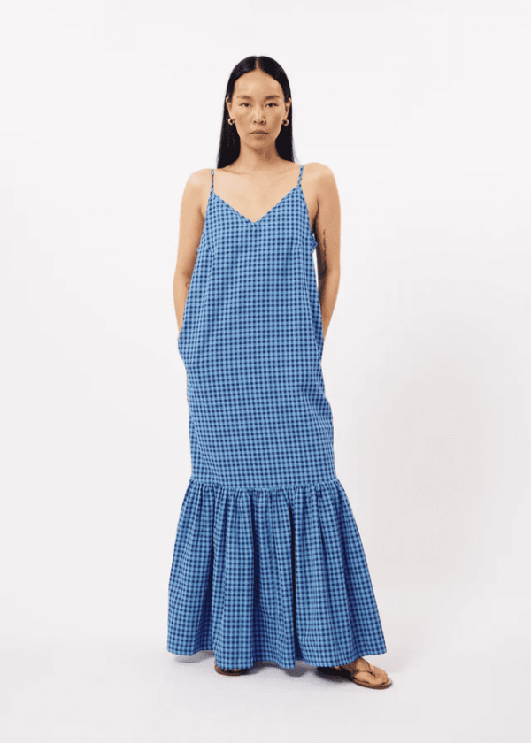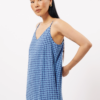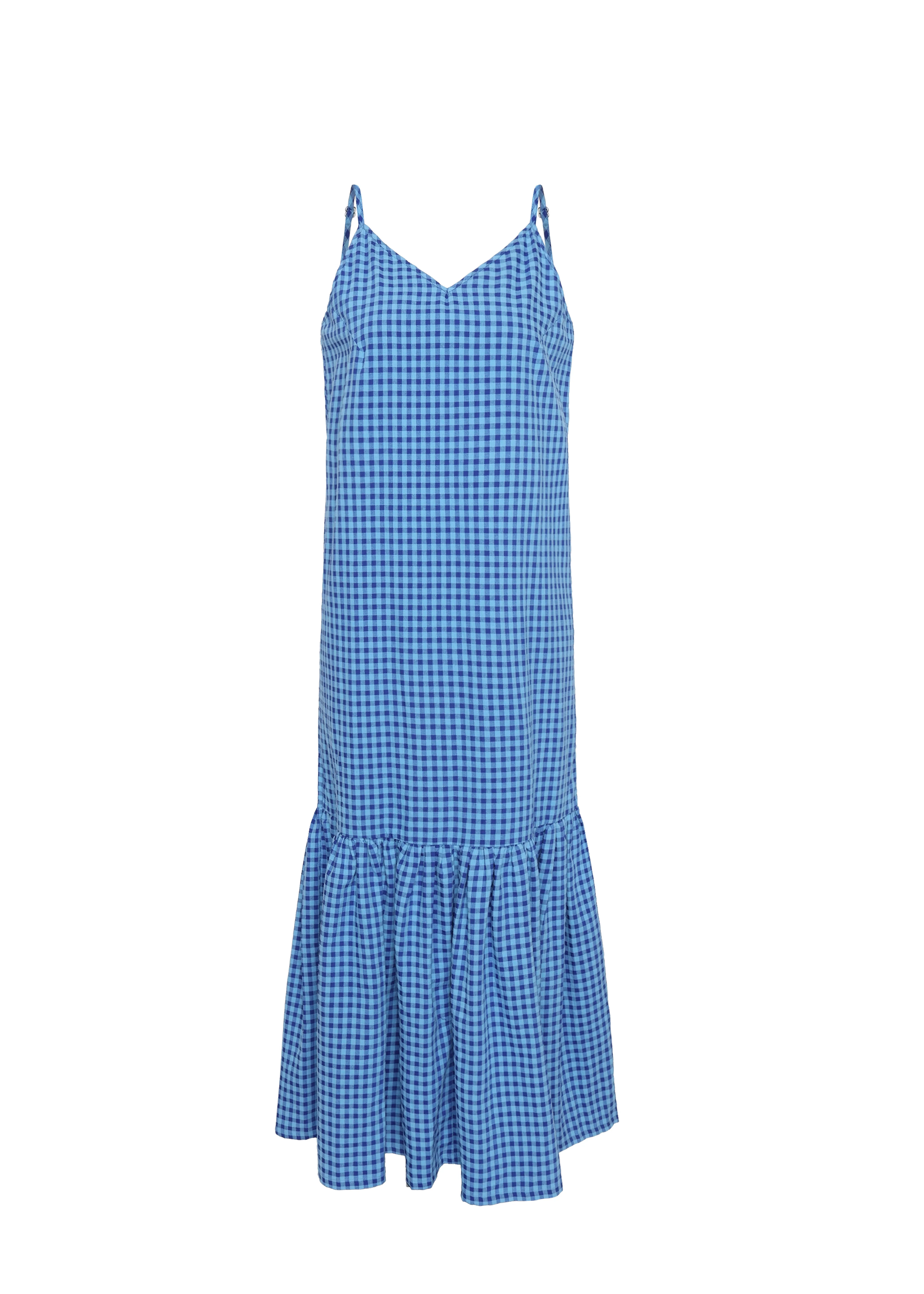 A long dress with check patterns throughout. Straight cut and thin straps, it is easy to put on when going out on the town or a casual stroll on the beach. A beautiful choice for you summer wardrobe