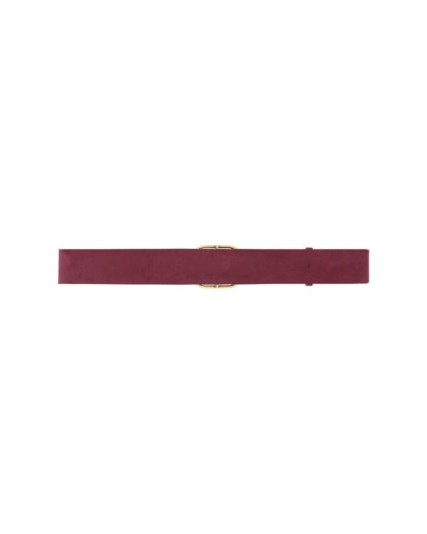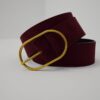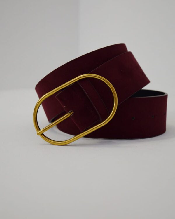 This bordeaux suede belt is timeless and the perfect accessory to enhance you look. Add a touch of refined elegance by adding this belt to a dress while creating structure and style. It features a gold metal buckle and comes in one size only.