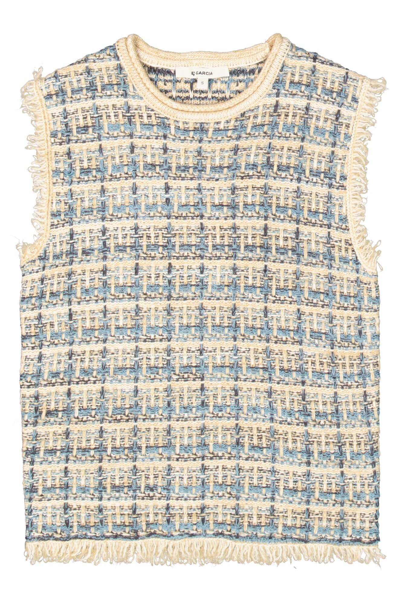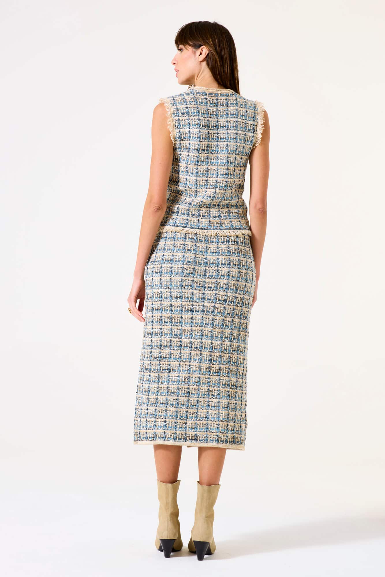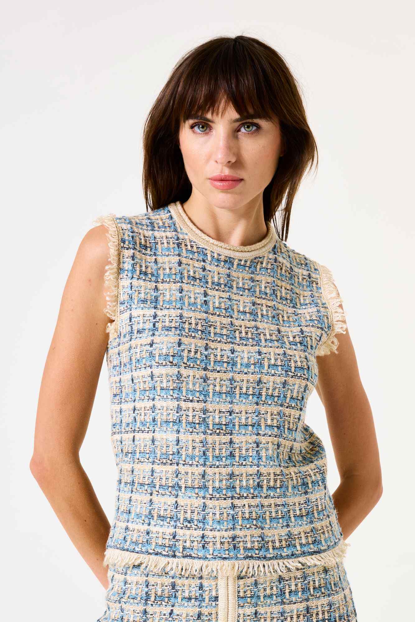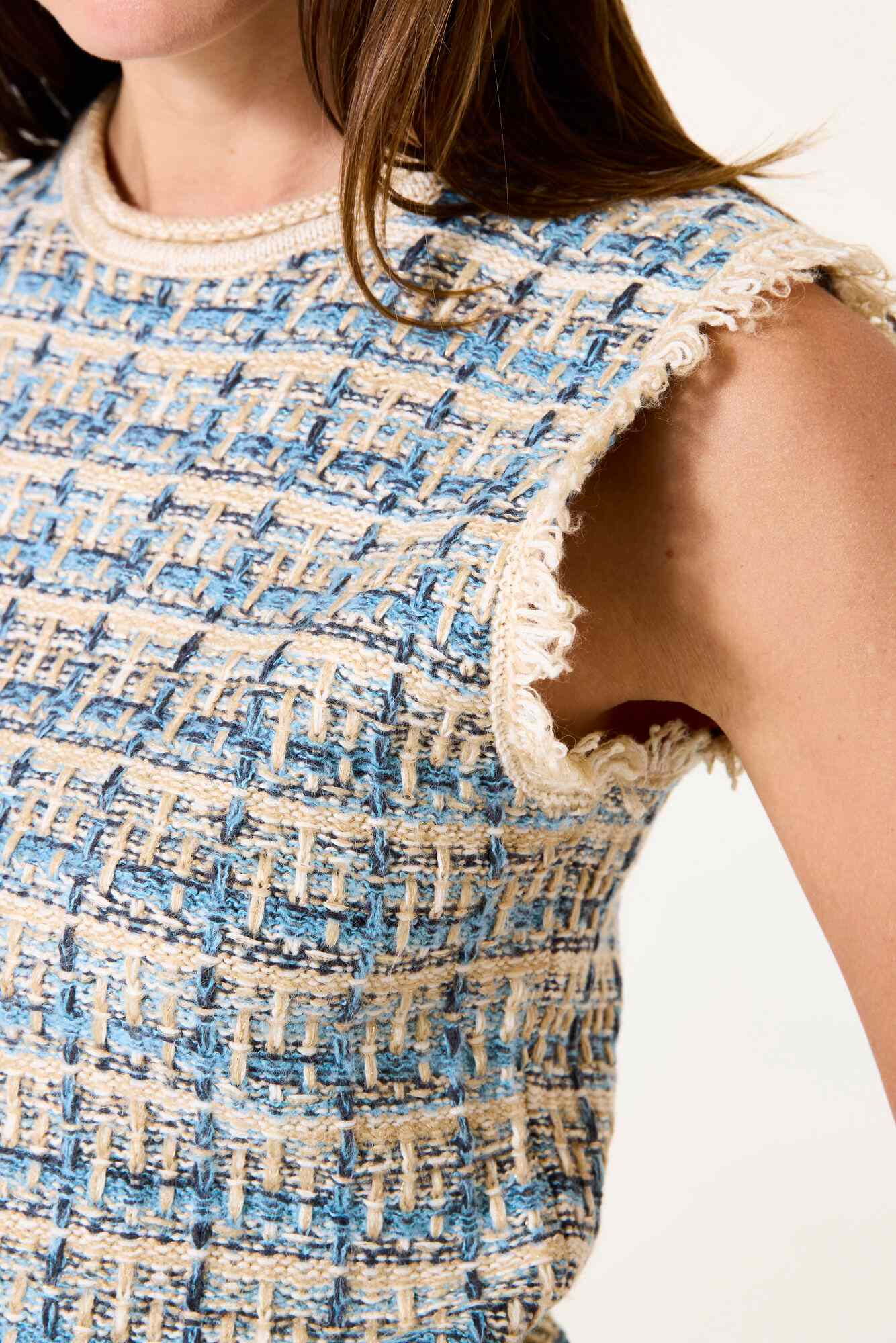 Gorgeous sleeveless knit. This sweater features a round neck and has a regular fit. Worn perfectly with the Nina Tweed Skirt