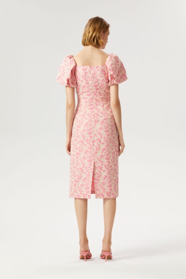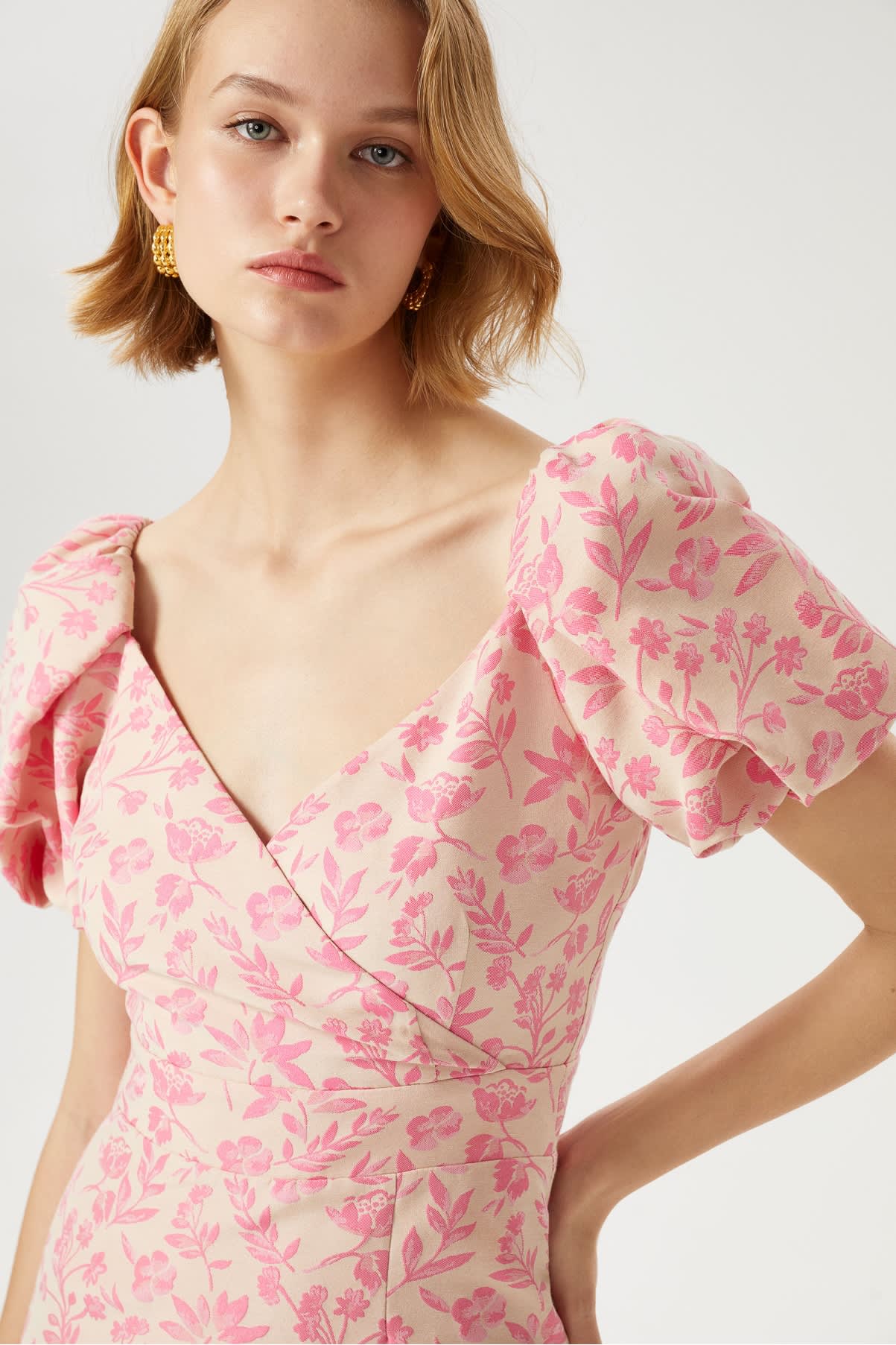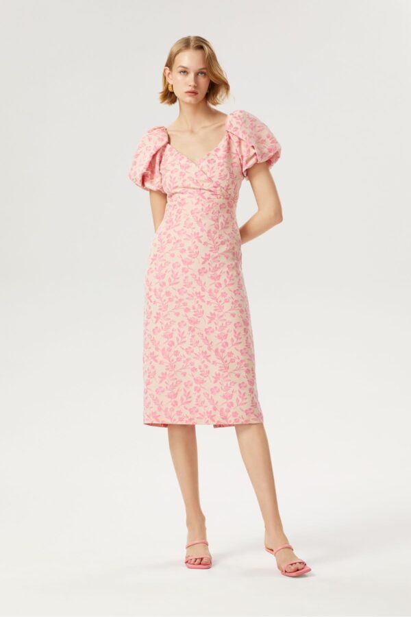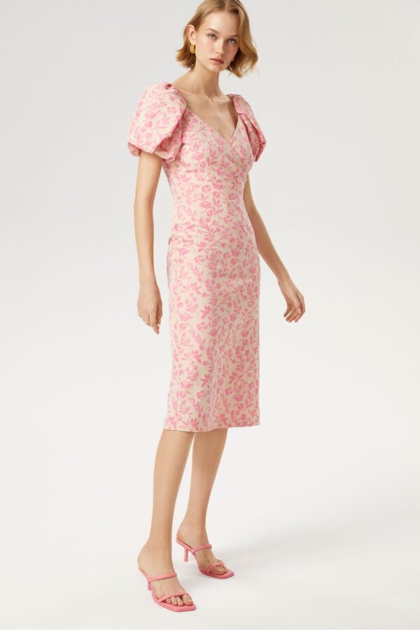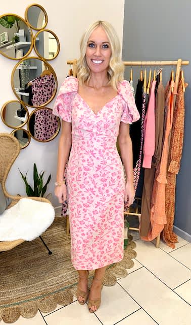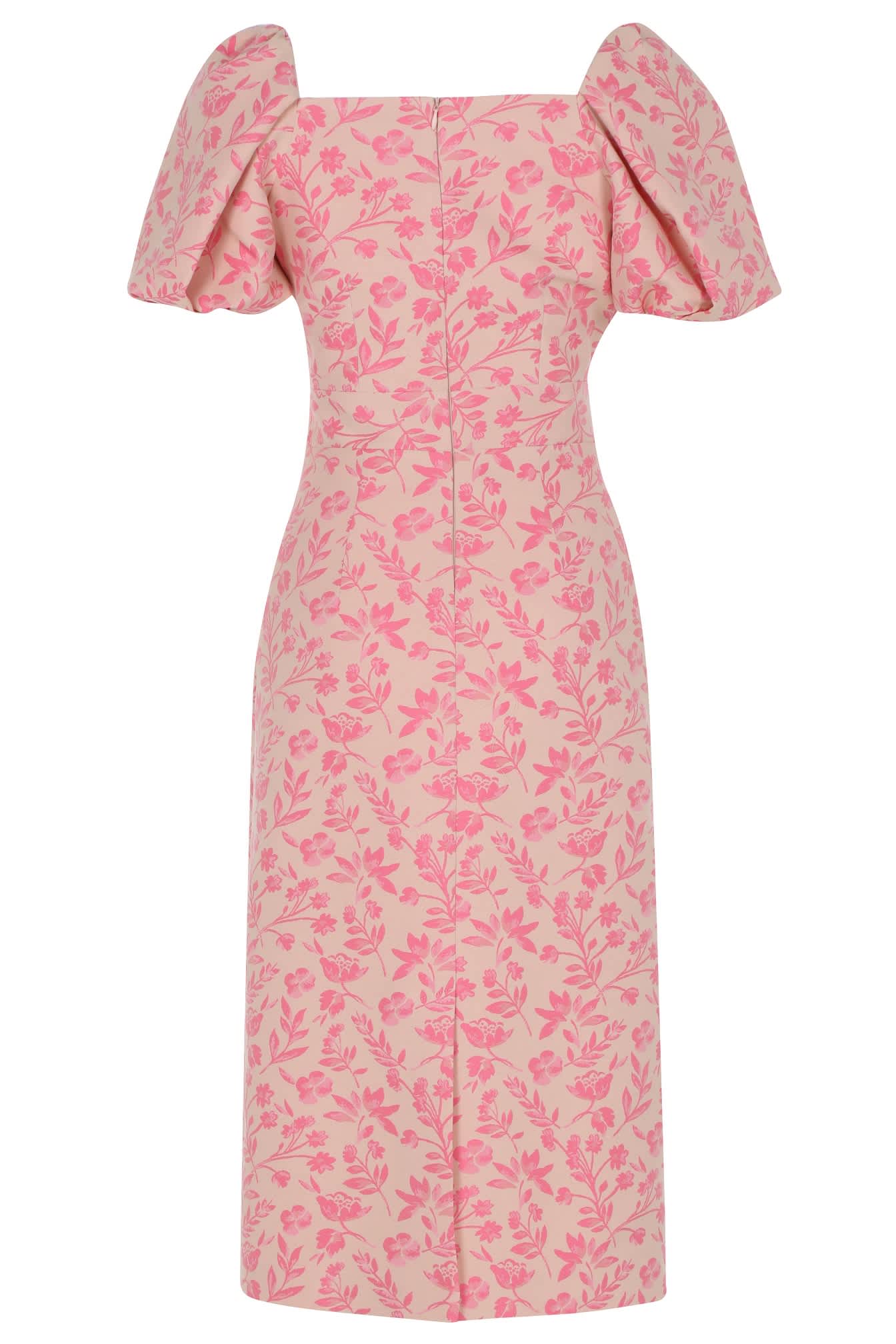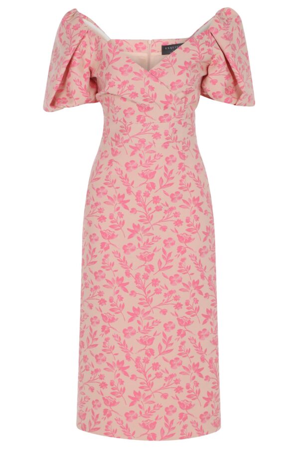 Fitted structured elegance. Soft neutral blush base with candy pink floral design design throughout.