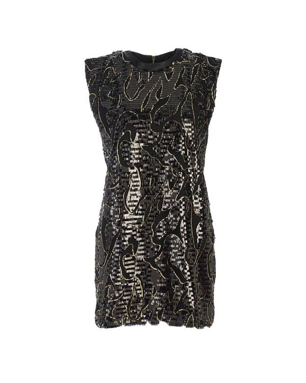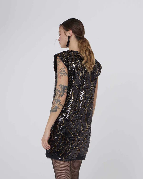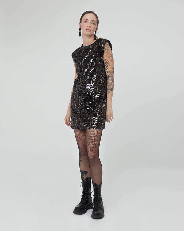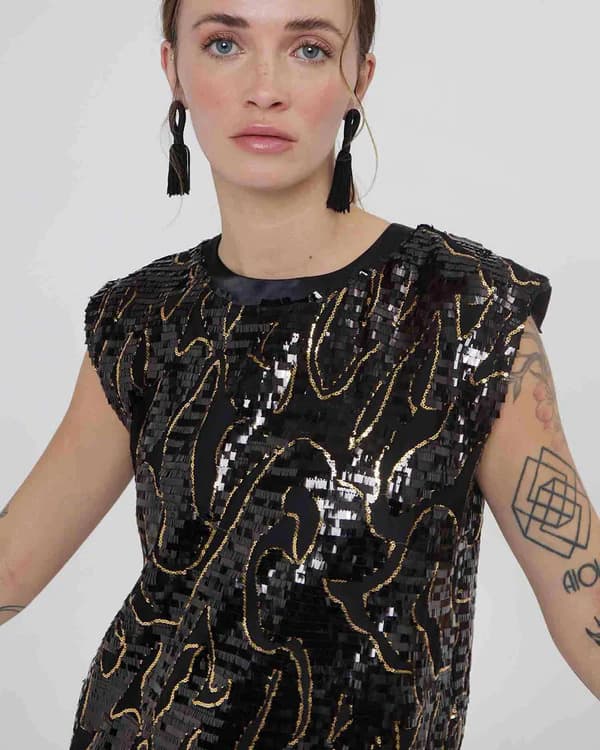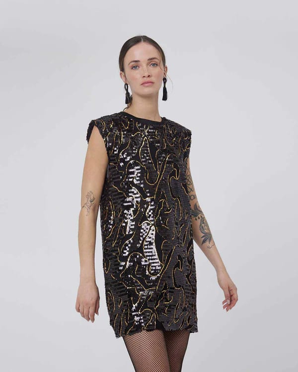 Short sequin dress from Silvian Heach. Shift style dress, black and gold sequin with mesh throughout. Satin neckline and under arm panel so you wont have sequins rubbing as you move. Fully lined. Gold zip closure to the back.