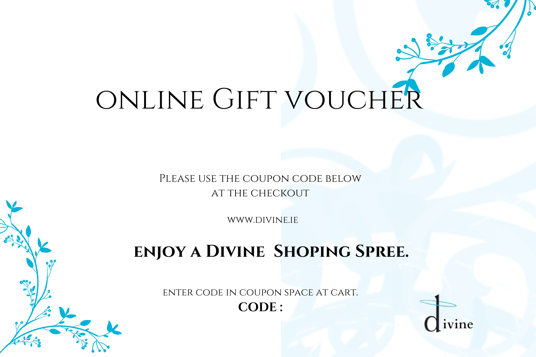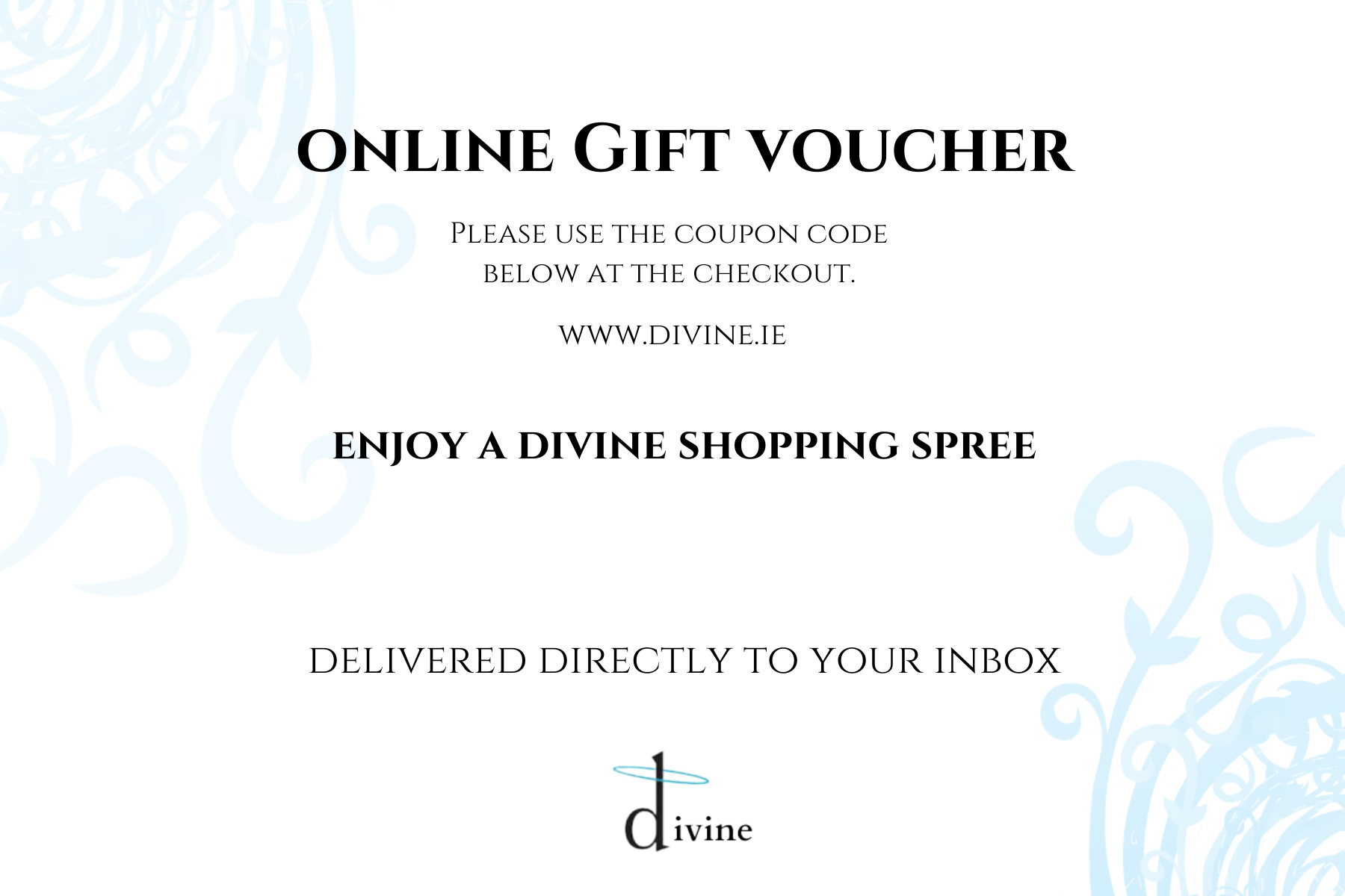 Gift cards are delivered by email. You will receive a gift card voucher code which you will be asked to enter during the checkout process on www.Divine.ie
