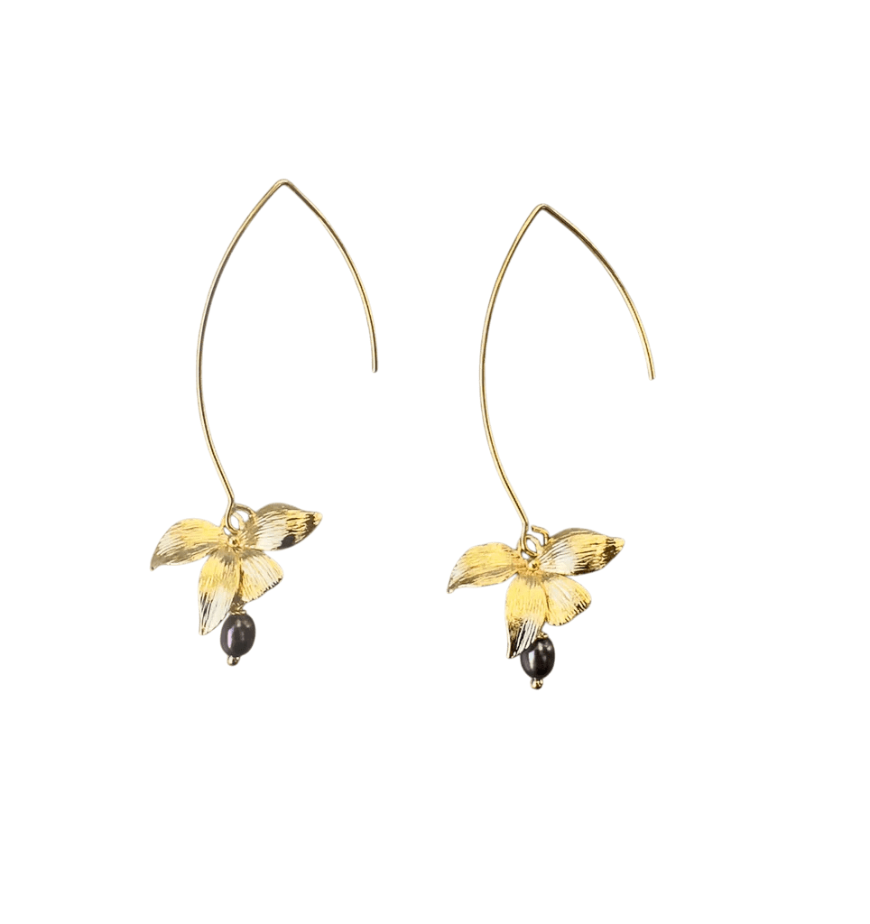 Petals earrings are handcrafted with gold plated brass petals, fresh water pearls and 16k gold plated hook wires.