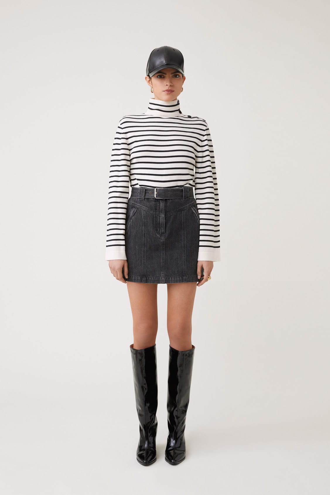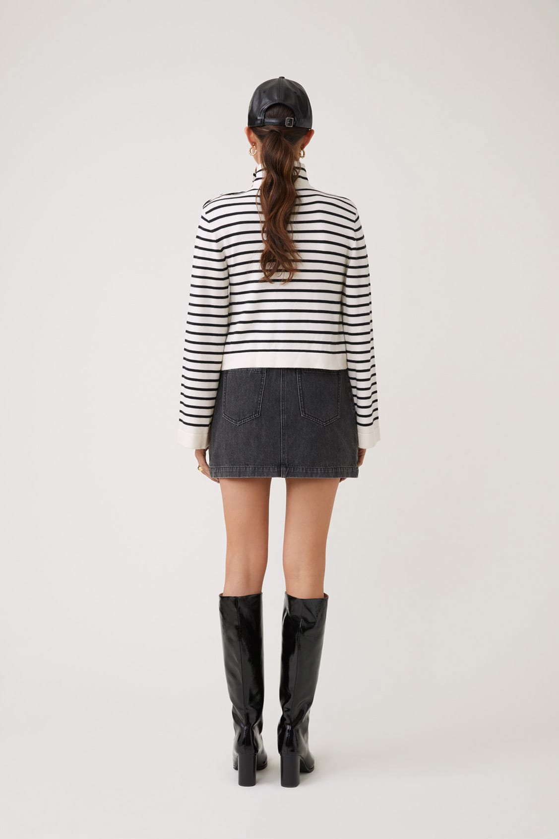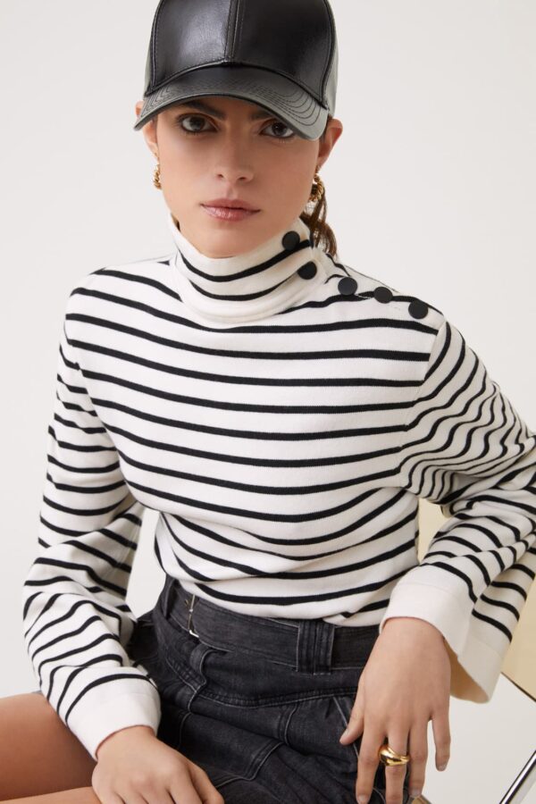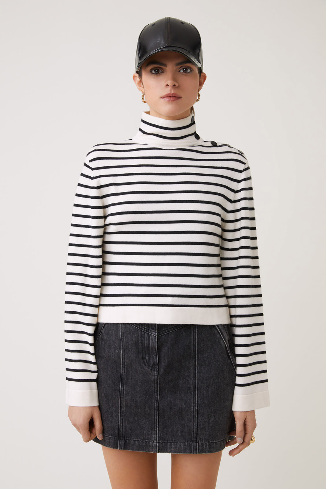 Short striped high neck sweater with buttoned stand-up collar, straight cut, ribbed finishes, long bell sleeves and all in a luxury striped colourway. Stay snug in this gorgeous knit this winter.