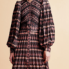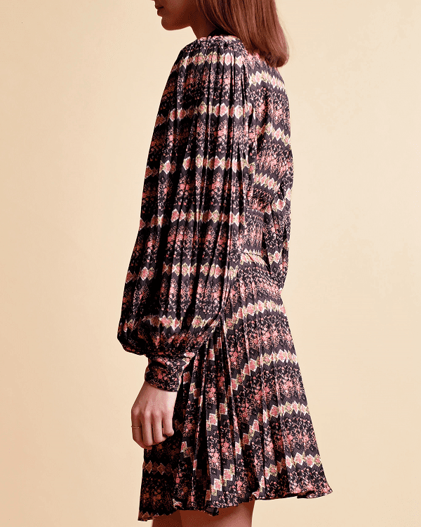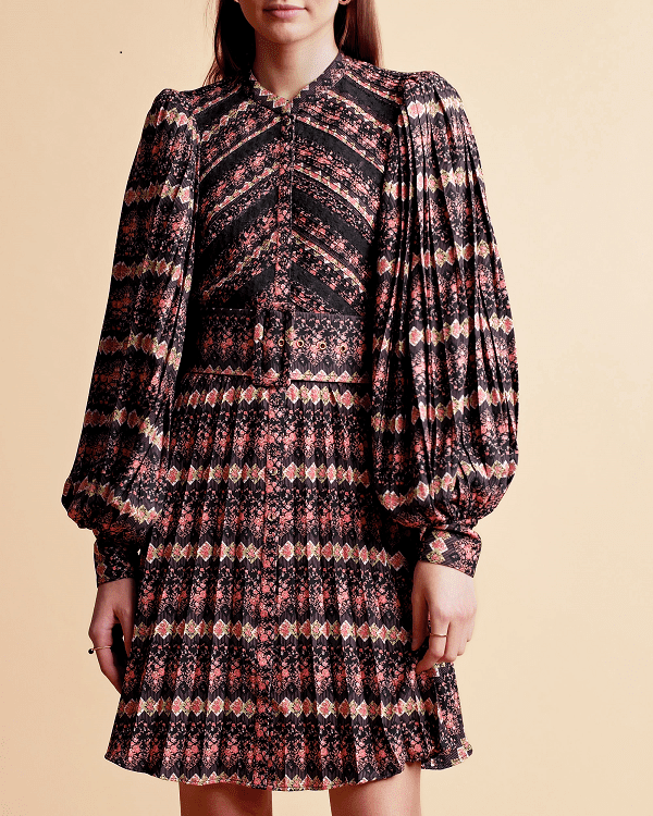 The Plissé Mini Dress is cut in airy and delicate polyester quality, made in a broad plissé technique. It has a mini length, fitted waistline and long, voluminous sleeves with tight cuffs. The dress has a round neckline with fabric covered buttons down the front. The dress has lace inserts down the front of the top and comes with a loose, matching belt.