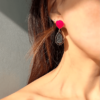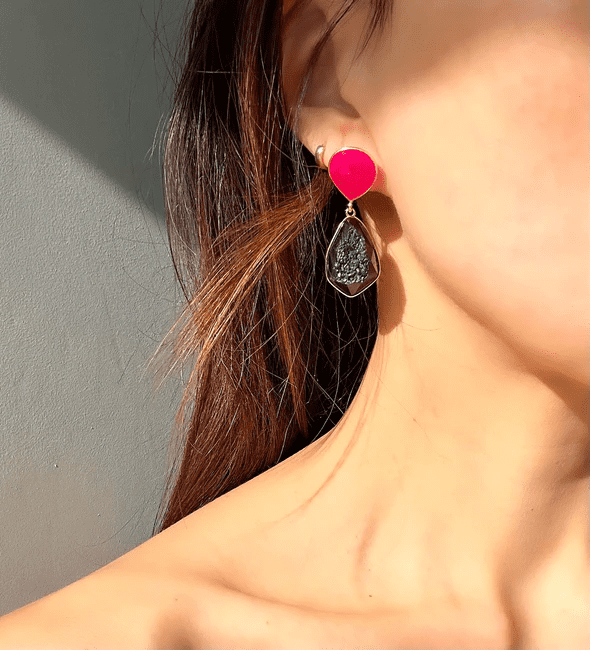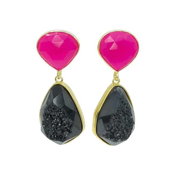About: Poppy earrings are handcrafted with stunning vibrant fuchsia chalcedony stones electroplated in gold and black metallic effect faceted druze agate teardrop stones set in 16 k gold plated brass. Post backs.