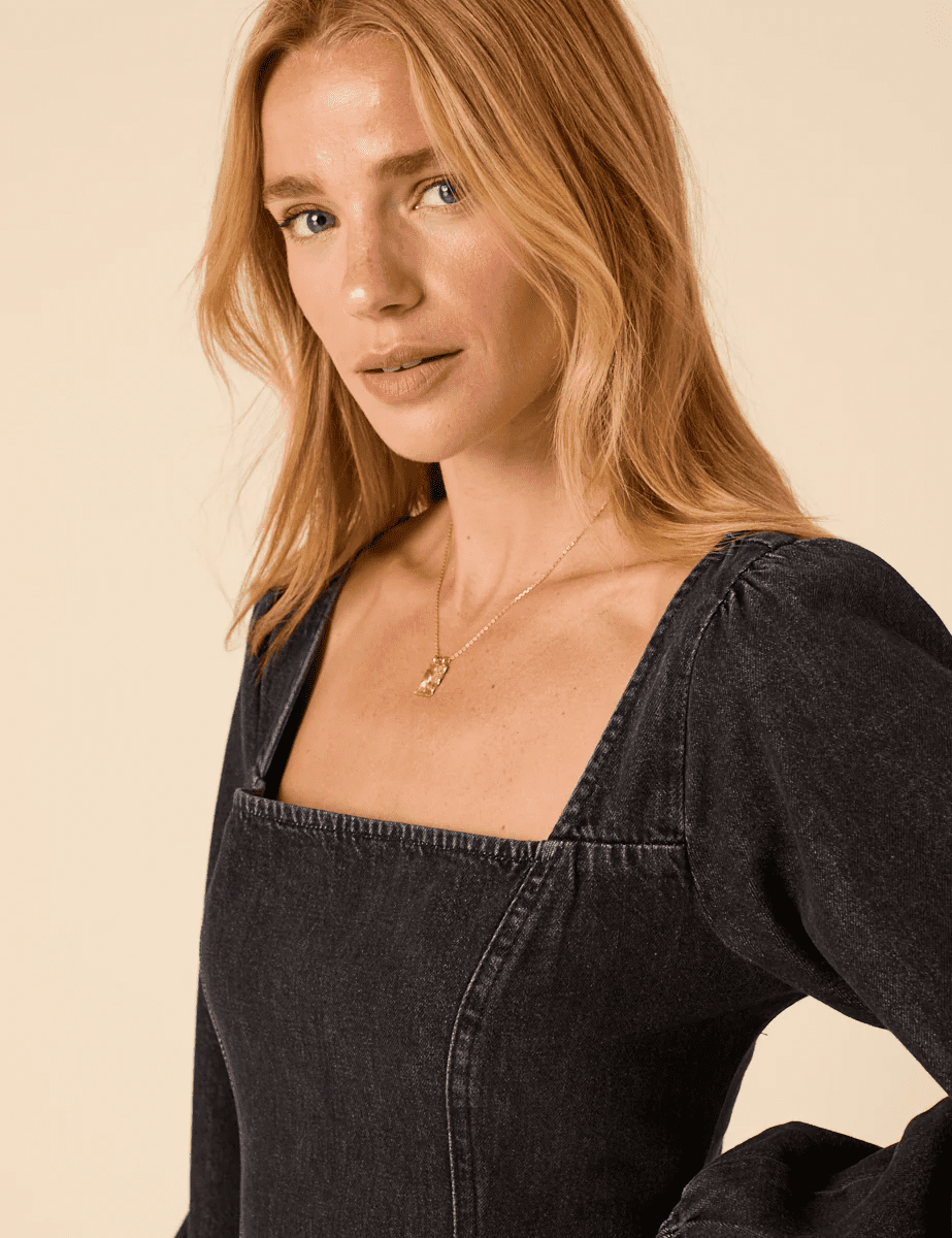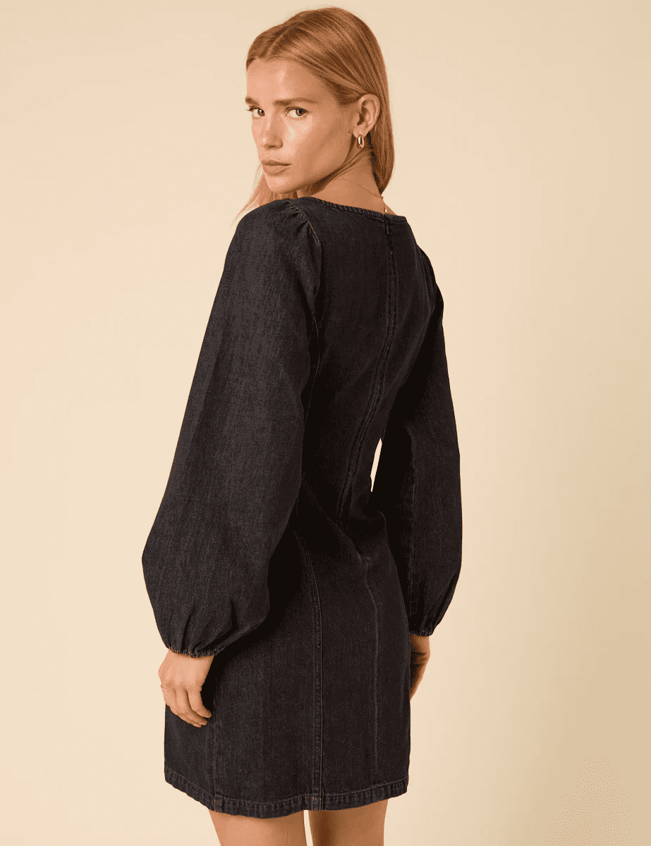 Square neck dark wash denim dress. Balloon sleeve detail with elastic cuff. Perfect for day to night wearing with heels or flats.