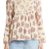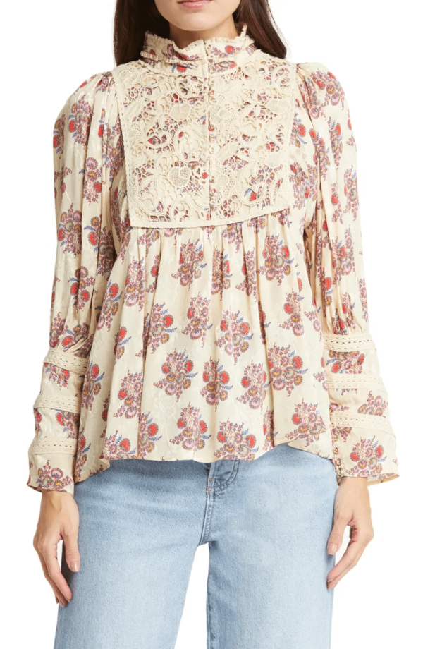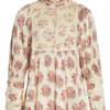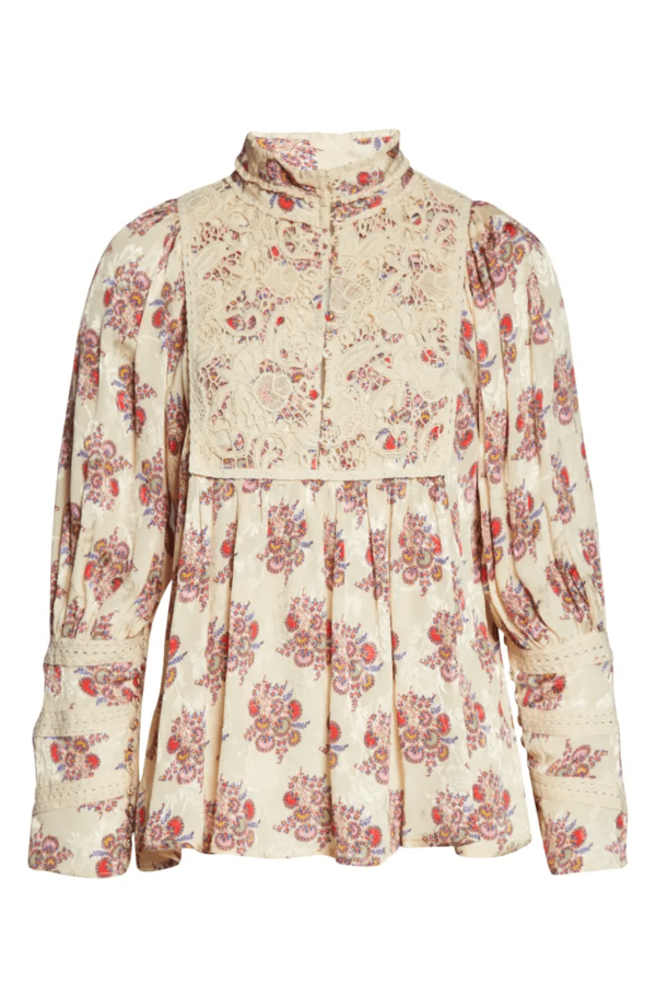 This blouse is cut in 100% certified viscose quality with a soft shine and delicate hold, and the jacquard pattern is a beautiful rose. It has a relaxed fit and long, voluminous sleeves with tight cuffs from the elbow down to the wrists. The blouse has a high neck with fabric covered buttons down the chest. The cuffs, neckline, front and back of the blouse has pretty lace inserts.